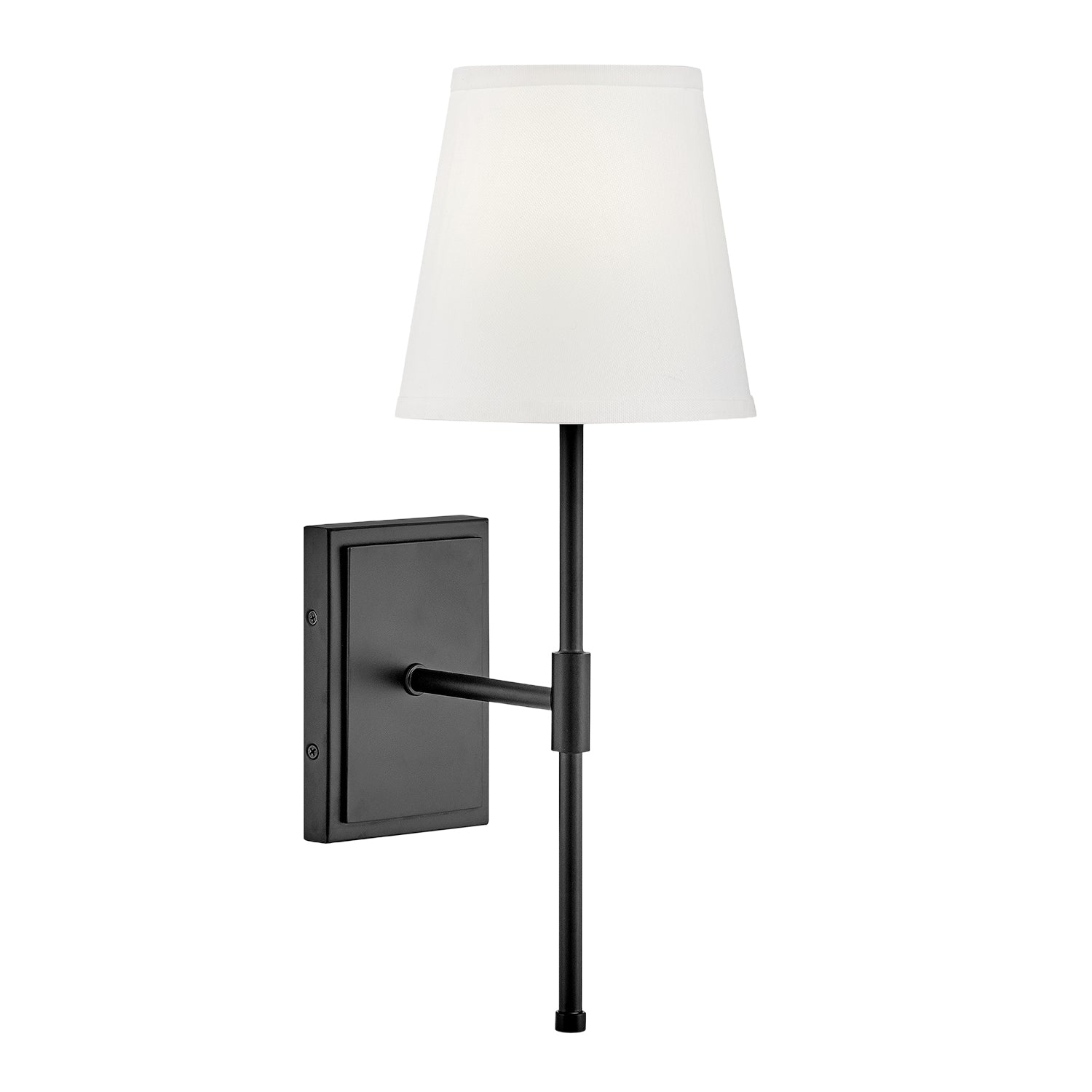 The Declan Wall Sconce 19" makes a refined statement, defined by its crisp, vertical lines and timeless, tailored design. The tall, clean-lined arm supports a white linen shade, creating an elegant vertical profile. This fixture is thoughtfully designed to provide soft, functional illumination that enhances any interior space. Perfect for adding refined vertical illumination to a hallway or positioned elegantly beside a framed mirror. With its ETL dry rating, it offers both functional beauty and versatile appeal. The bold Black finish enhances the fixture's tailored silhouette, resulting in a look of enduring style and timeless elegance. This striking collection delivers enduring style and a perfect blend of elegance and simplicity.