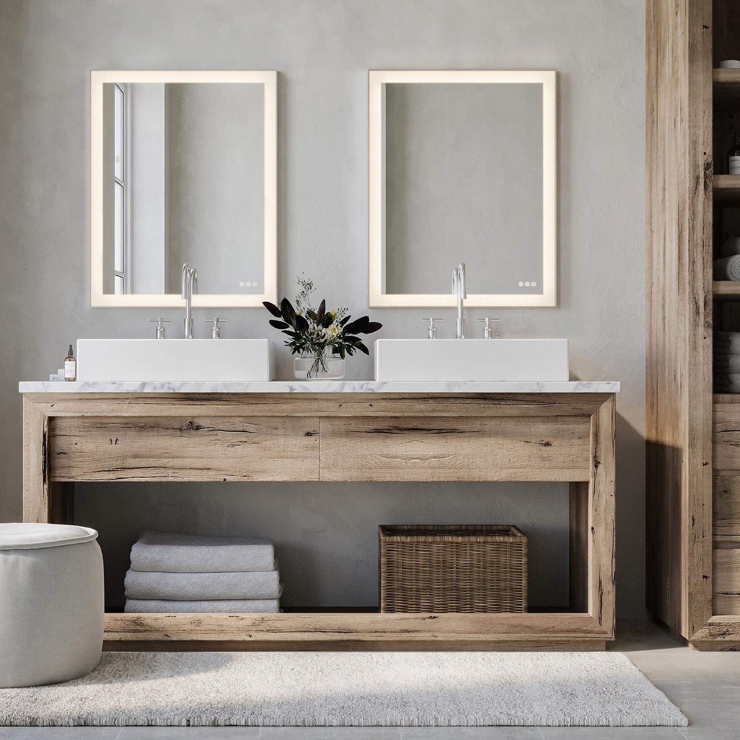The Demott Large LED Rectangular Mirror makes a refined statement with its sleek silhouette and brilliant, integrated lighting. Its clean, minimalist design radiates a soft, sophisticated halo of light from its perimeter, creating a seamless glow. The mirror offers advanced functionality with a touch-sensor switch for stepless dimming, adjustable color temperature, and a built-in defogger for a crystal-clear reflection. Its versatile design allows for both vertical and horizontal mounting, offering a flexible and elegant solution for any space. ADA compliant and ETL damp-rated, this mirror is a perfect and elegant addition to a bathroom or powder room. The beautiful Brushed Nickel finish provides a cool, refined tone that enhances the mirror's minimalist style, bringing a touch of timeless sophistication to your home.
