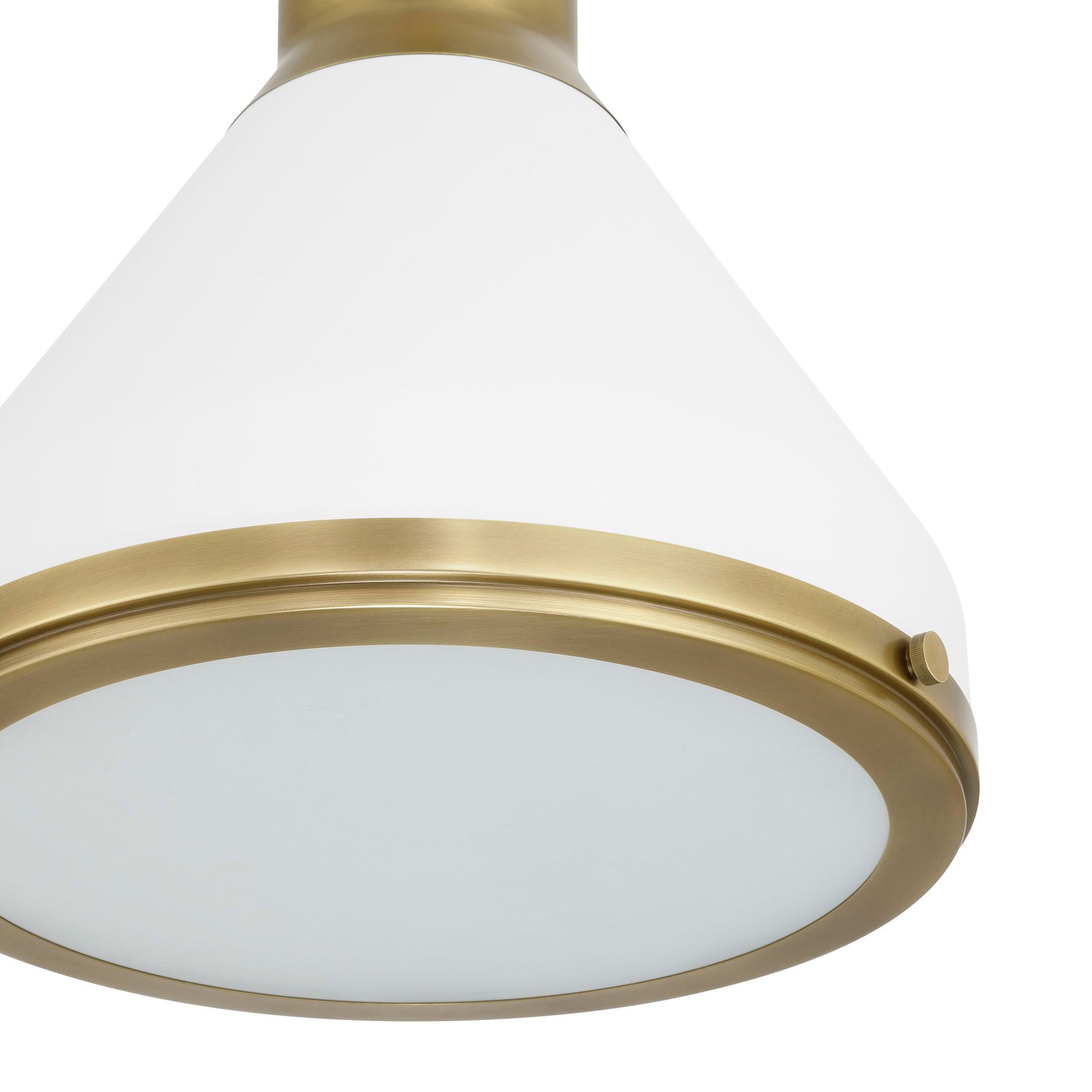 • Drew pendant features a bold and modern conical design that utilizes Aged Brass detailing to add warmth and architectural depth to the Matte White finish