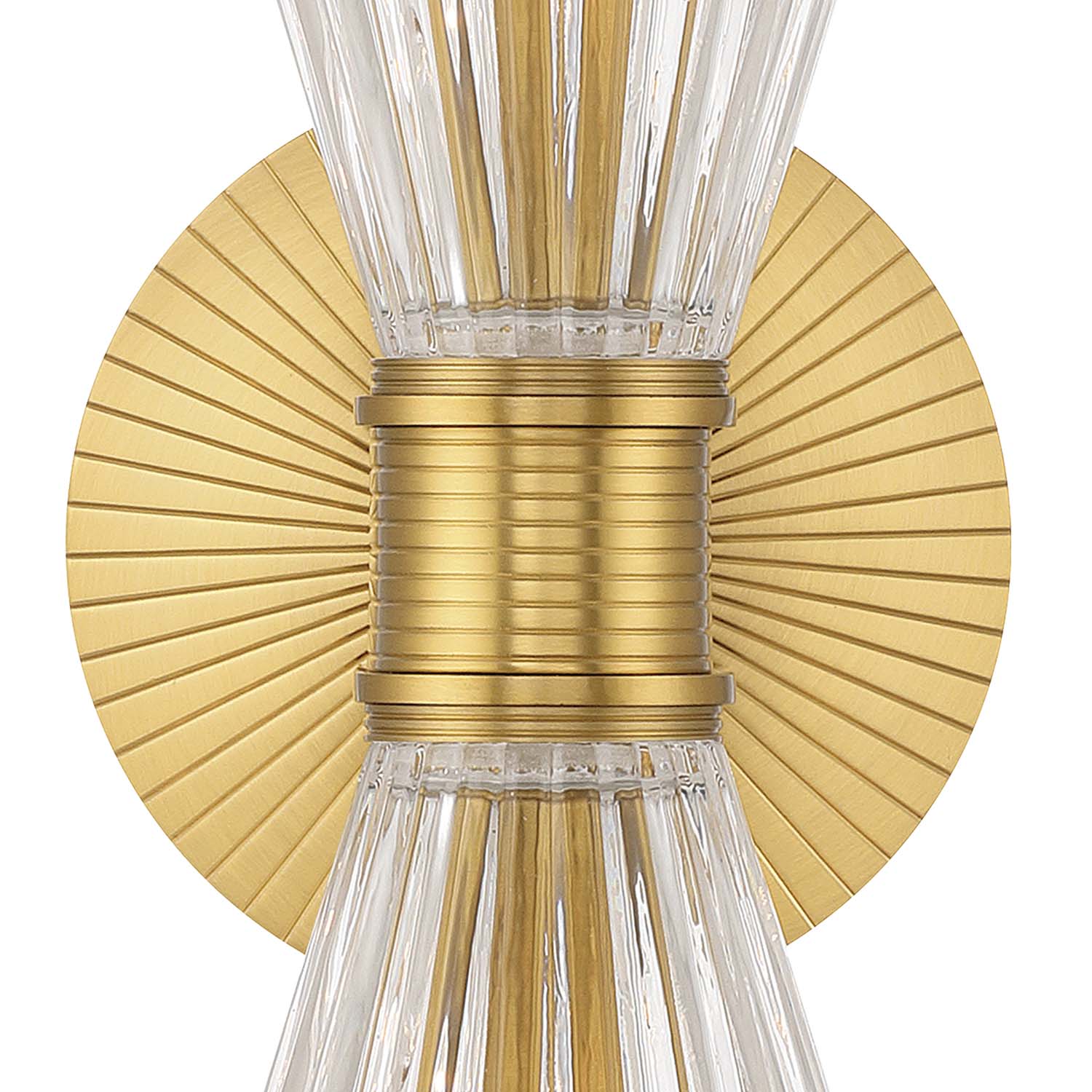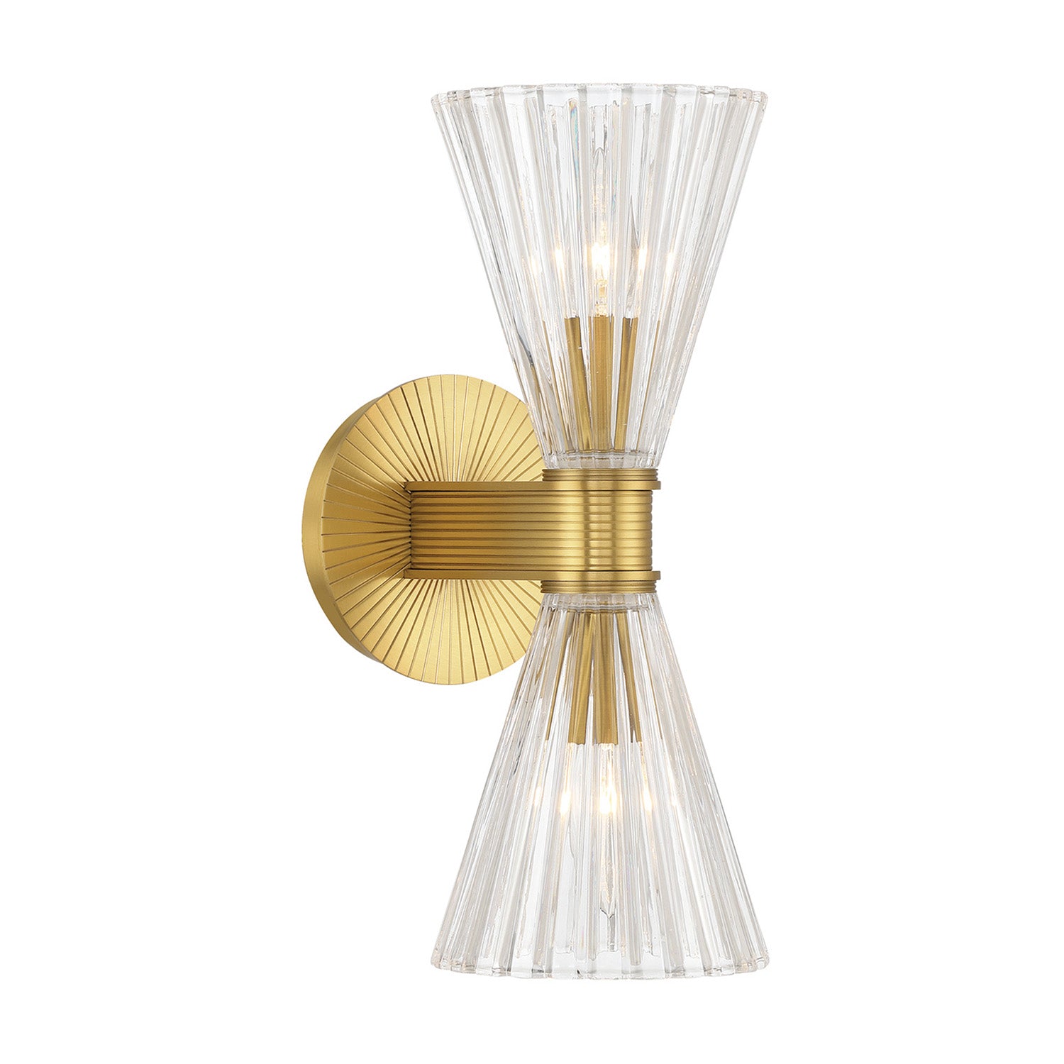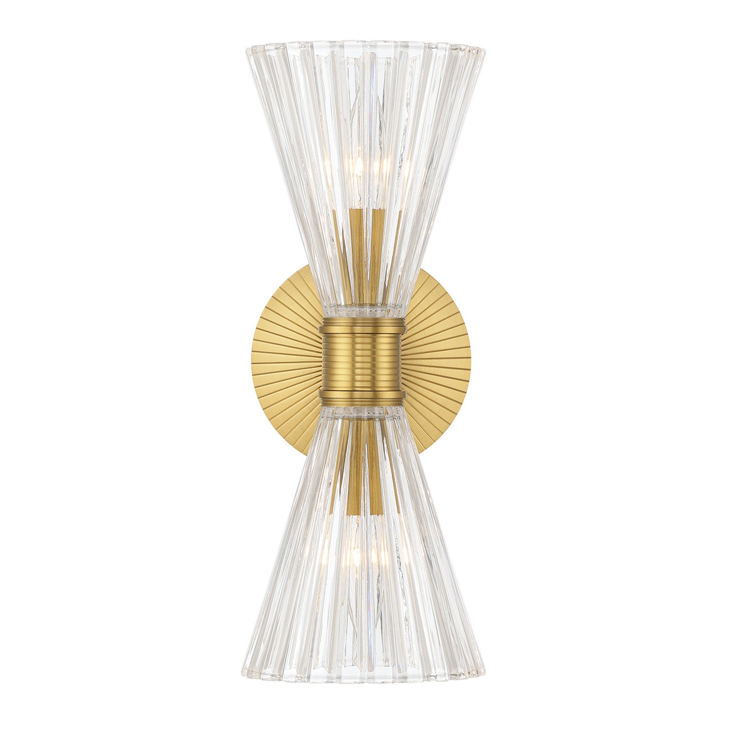 • Features two elegant ribbed clear glass shades that beautifully diffuse light against a radiant, deco-inspired backplate