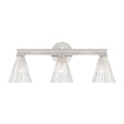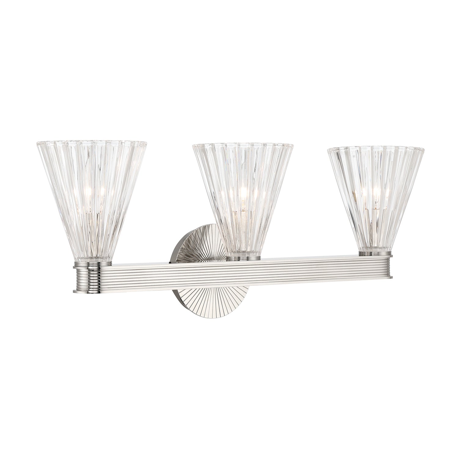 The Eliza 3 Light Vanity brings subtle texture and dimension to modern interiors through its expertly crafted clear ribbed glass. This fixture artfully balances an expansive architectural presence with a distinct conical shape, designed to refract light with understated poise. Paired with streamlined forms, the design offers a sophisticated versatility that integrates seamlessly into both contemporary and transitional spaces. The Polished Nickel finish creates a brilliant, reflective anchor that beautifully complements the textured glass surface, ensuring a well-distributed light across larger vanity areas.
