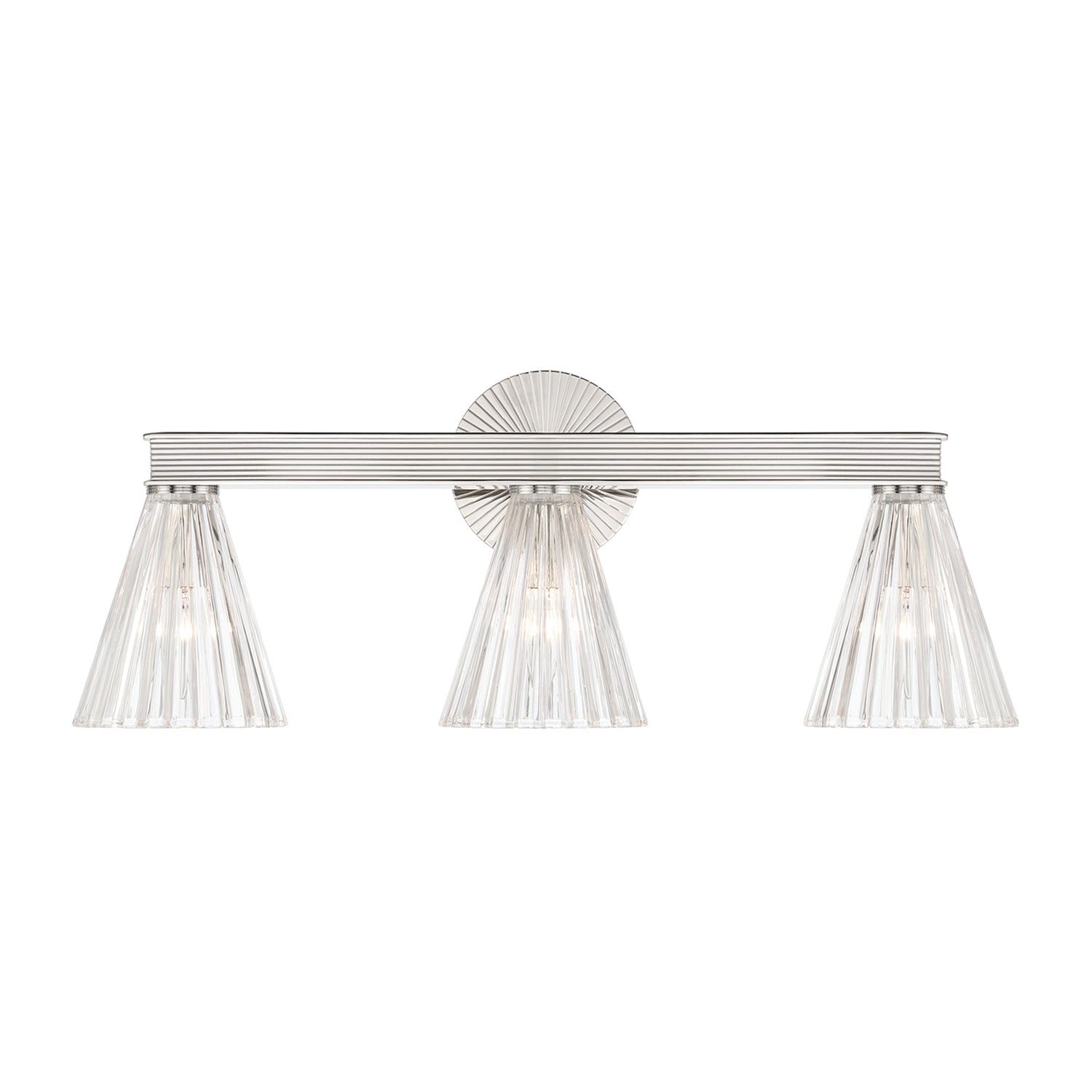 • Features three elegant ribbed clear glass shades that beautifully diffuse light against a radiant, deco-inspired backplate