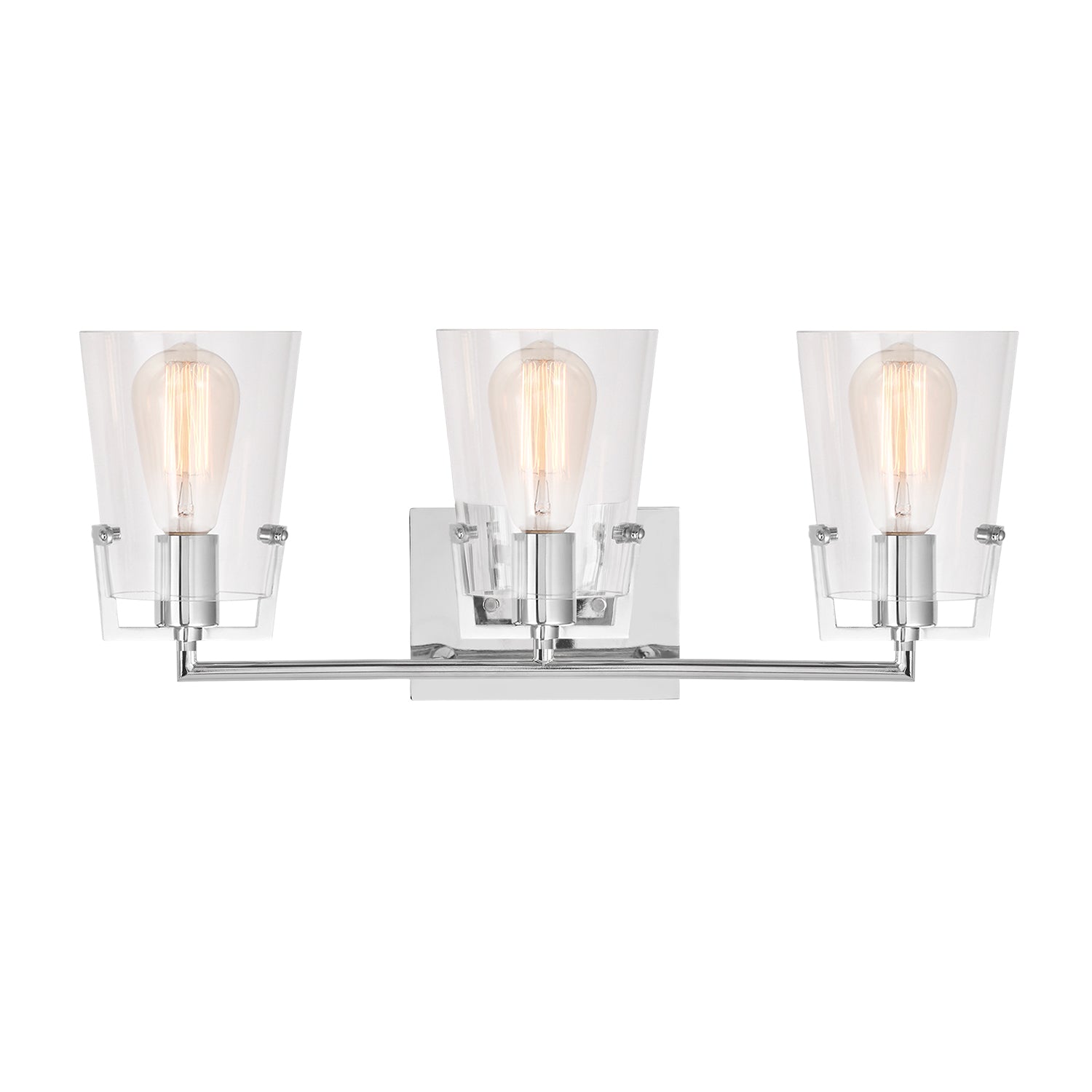 The Glyn 3 Light Vanity delivers a clean-lined silhouette with a clear glass shade, making an elegant statement with its modern simplicity. Its sleek, horizontal bar and rectangular backplate beautifully showcase three exposed bulbs within clear glass shades, providing a bright and refined glow. This fixture is a perfect lighting solution for a vanity, with the versatility to be mounted in either the up or down position. Its ETL damp rating makes it an ideal choice for a bathroom, powder room, or any space where modern style and functional light are needed. The brilliant Chrome finish provides a sleek, reflective sheen that enhances the clean lines, adding both functional beauty and versatile appeal.
