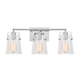 • Modern vanity light with a clean-lined silhouette and three clear glass shades
