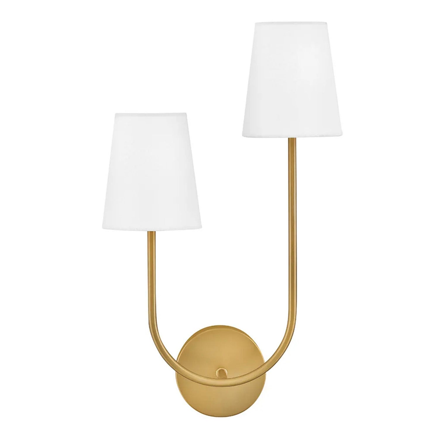 The Greta Double Wall Sconce (Left) makes a graceful statement with its classic U-shaped silhouette and tailored aesthetic. This fixture features twin arms supporting white linen shades, with the overall design specifically oriented to be mounted facing left. It provides a soft, upward and downward glow, offering refined ambient illumination to any dry interior space. This fixture is perfect for creating a matched, symmetrical pair when partnered with its opposite-facing sconce, or for adding solo elegance to a hallway or bedroom. The warm Satin Brass finish enhances the clean, curved lines, resulting in a look of enduring style and timeless elegance.