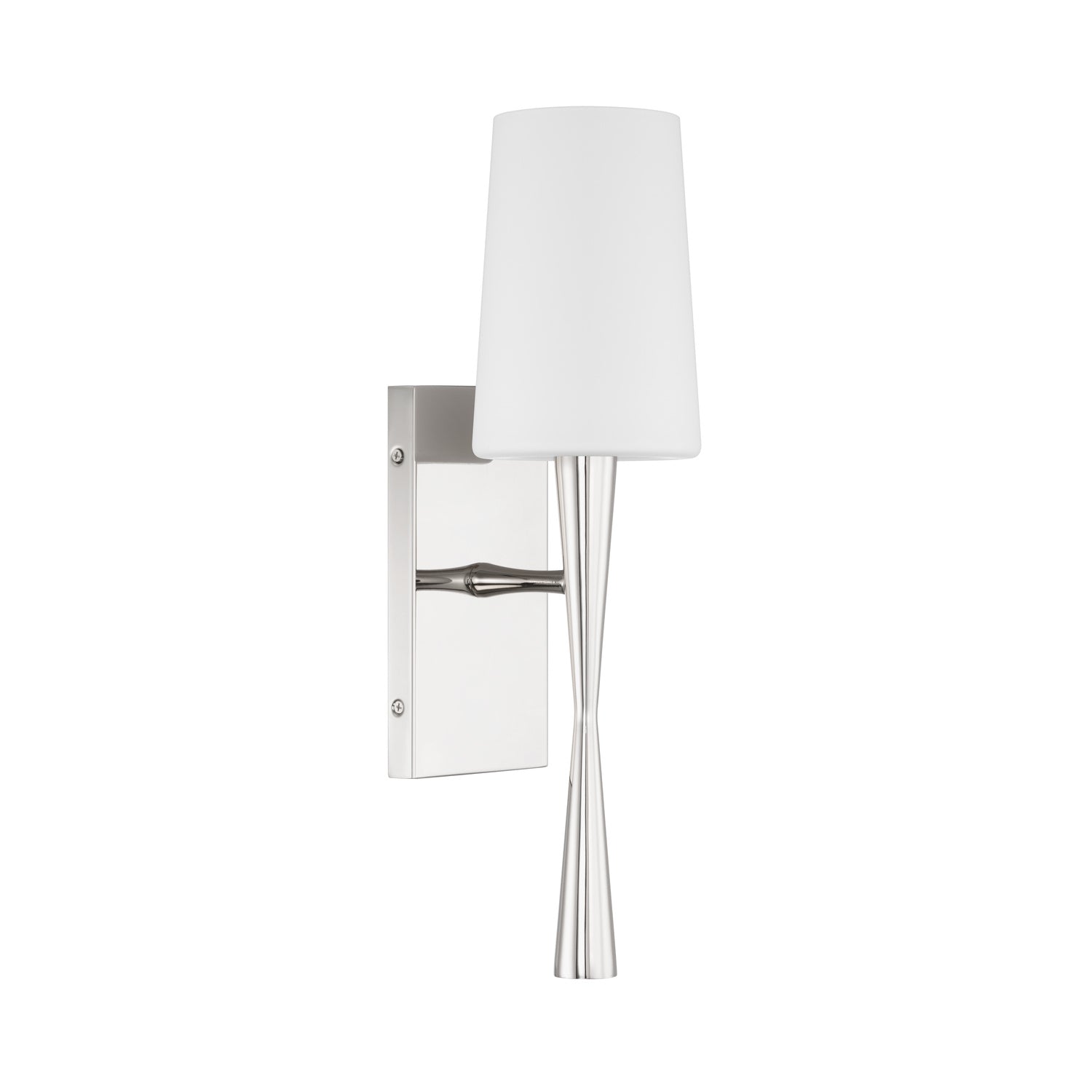 The Kellan Wall Sconce 18" is both timeless and transitional, featuring a minimalist design that is ideal for any space in the home. The sleek shade and slender hourglass metal stem make an immediate impression in any room, reflecting light beautifully through its polished surfaces. Mounted on a rectangular backplate, this light offers a fresh twist on a classic silhouette, providing a bright and airy feel to hallways or vanities. The radiant Polished Nickel finish highlights the crisp, architectural details of the fixture, offering a sophisticated and luminous presence that brightens any room.