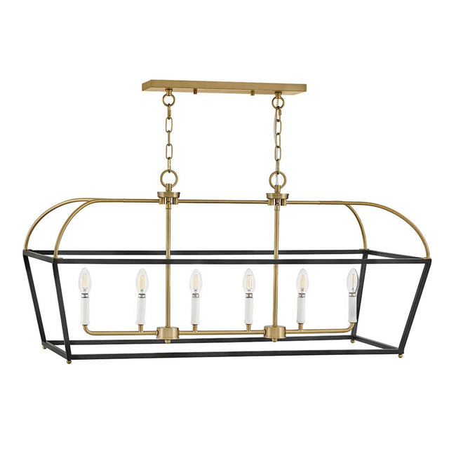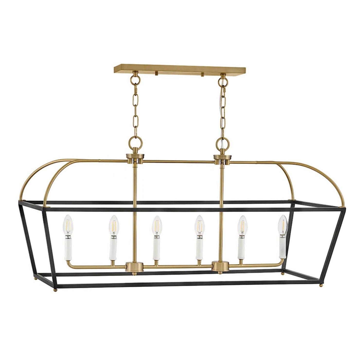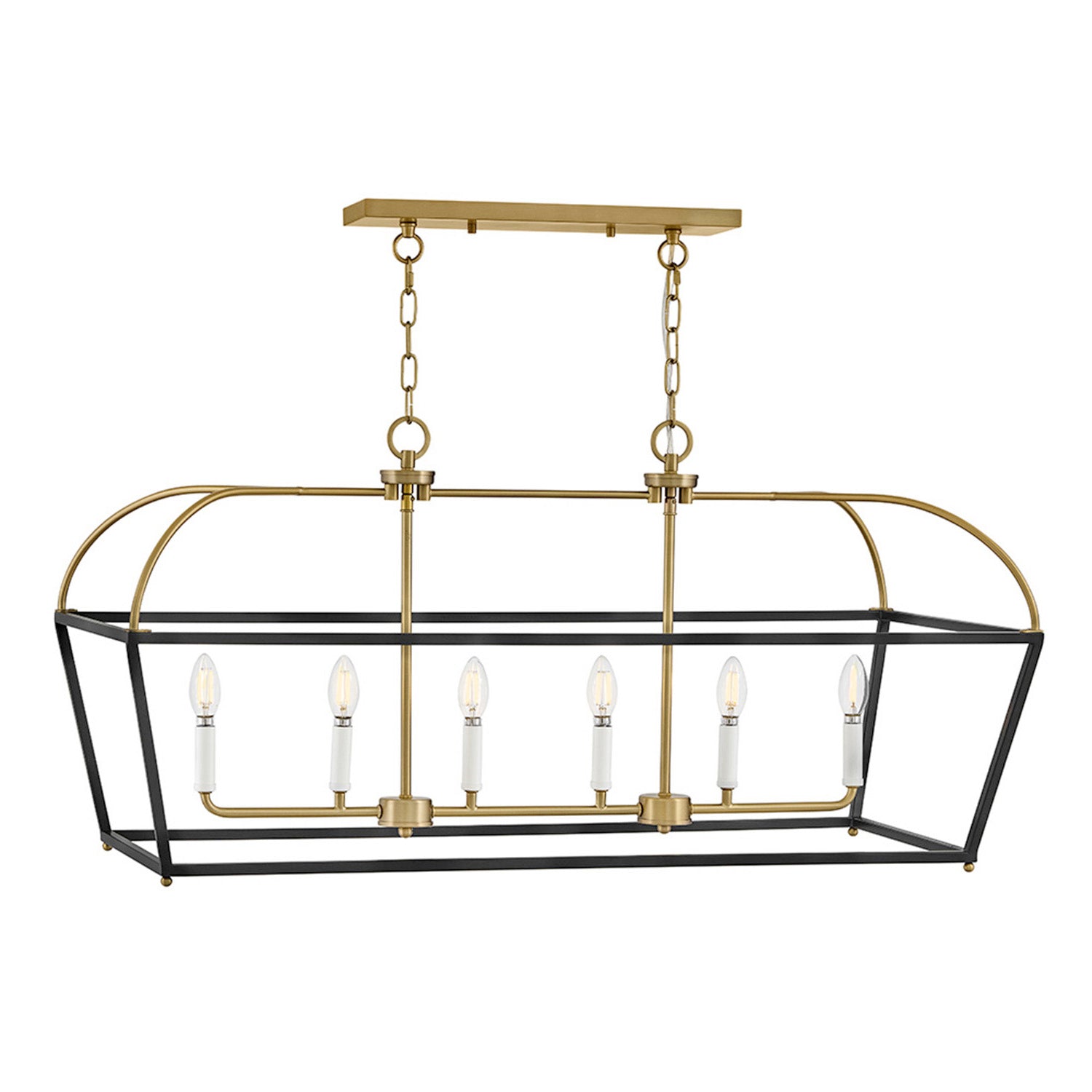 • Transitional lantern-style linear chandelier featuring an extended geometric frame and a bold, two-toned finish