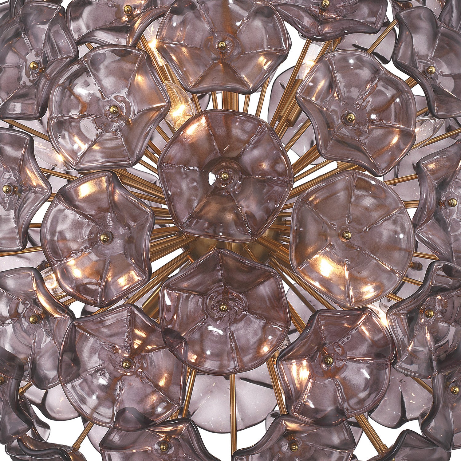 • Features a stunning Sputnik-inspired round design with aged brass arms radiating from a central hub, each ending in a hand-blown smoke glass petal