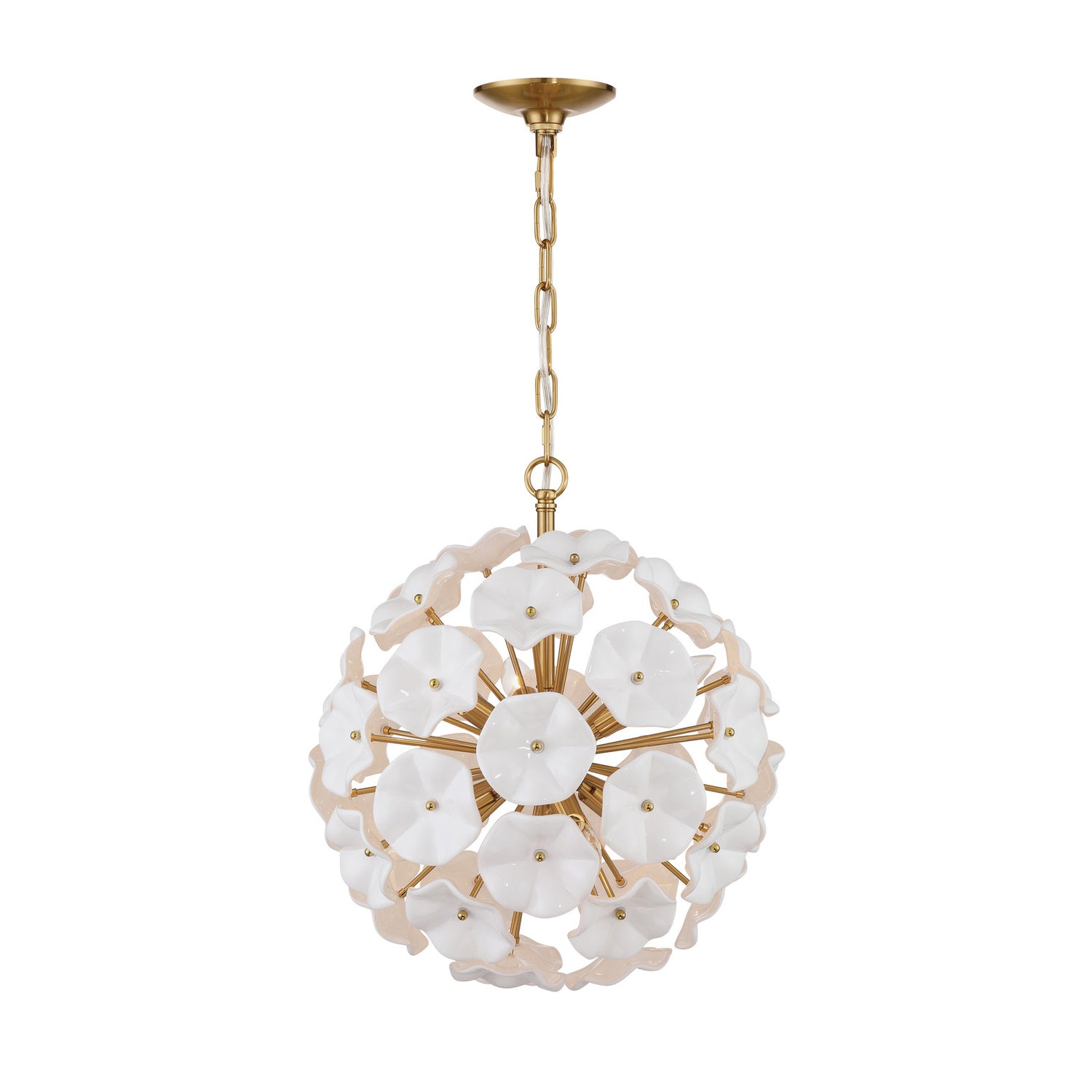 The Layla Glass Pendant brings mid-century modern lighting to striking new heights with its breathtaking silhouette. From its central aged brass hub, slender arms radiate outward like rays of light, each culminating in a hand-blown white glossy glass petal. This 6-light pendant captivates both day and night—standing as a sculptural centerpiece when unlit and casting a soft, radiant glow through its glass petals when illuminated. The Aged Brass finish provides a warm counterpoint to the crisp white glass, balancing vintage charm with contemporary elegance. At 18.25" in diameter, the Layla makes a dramatic statement in dining areas, foyers, or living rooms, becoming not just a source of illumination but a conversation-starting work of art.