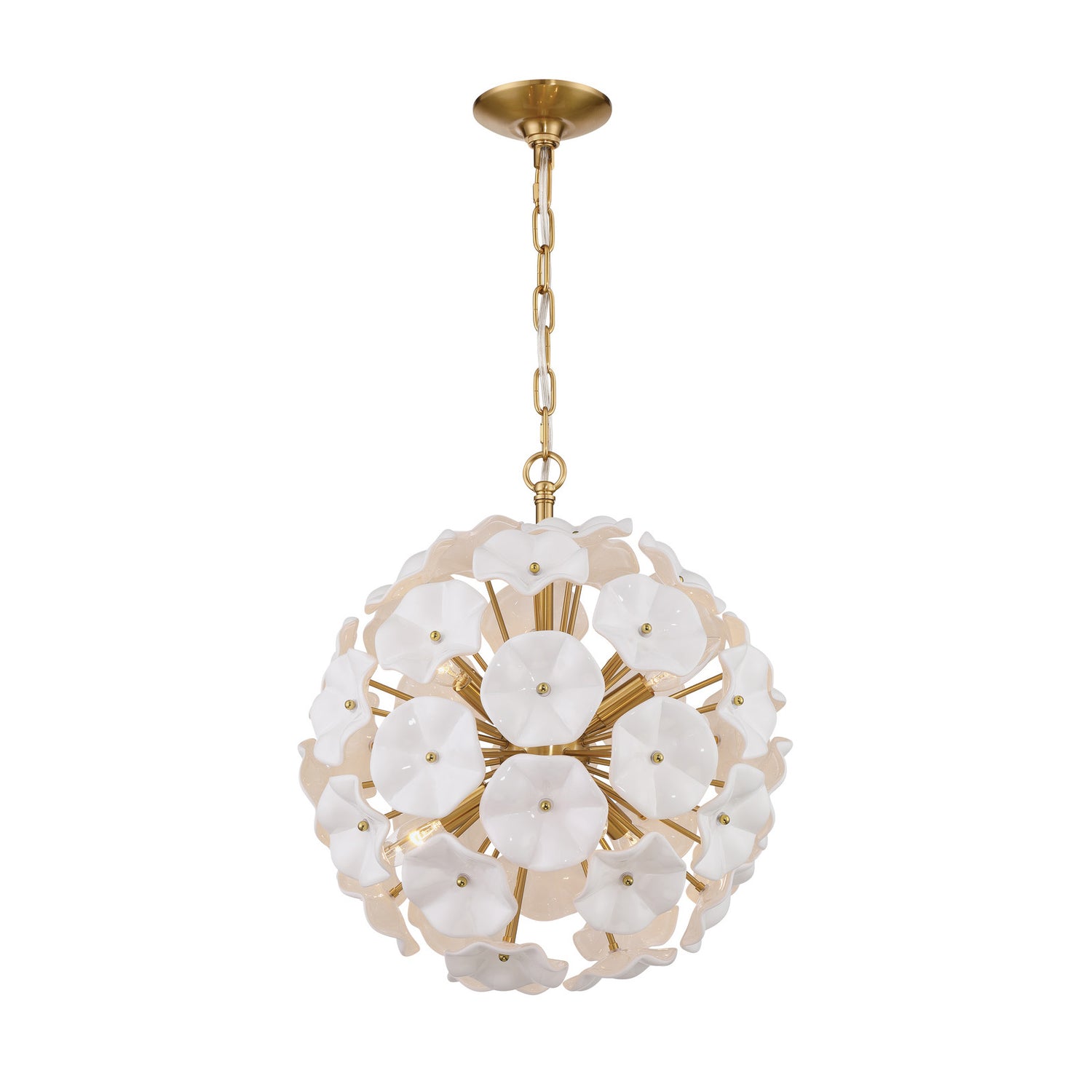 • Features a stunning Sputnik-inspired round design with aged brass arms radiating from a central hub, each ending in a hand-blown glossy white glass petal