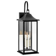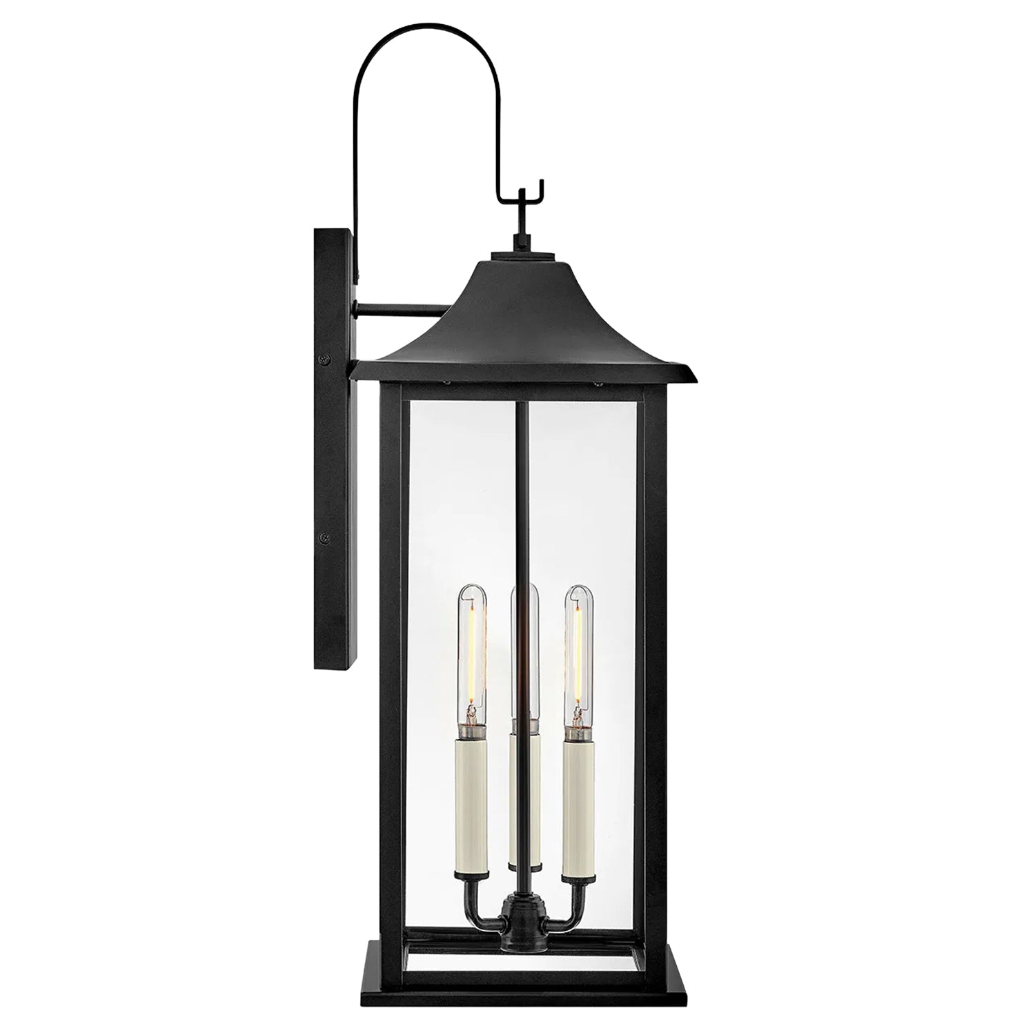 The Lorraine Large Outdoor Wall Light is a classic exterior lantern that features a distinctive, graceful shepherd's hook arm. The fixture’s clean rectangular frame and clear glass panels beautifully house the three exposed candelabra bulbs, creating a welcoming, enduring silhouette. Crafted from durable materials, this outdoor light fixture is built to withstand the elements, providing bright, welcoming illumination that enhances the safety and curb appeal of your home. With its ETL wet rating, it is a perfect solution for any entryway, porch, or exterior wall. The sophisticated Black finish delivers enduring, traditional style and a perfect blend of form and function.