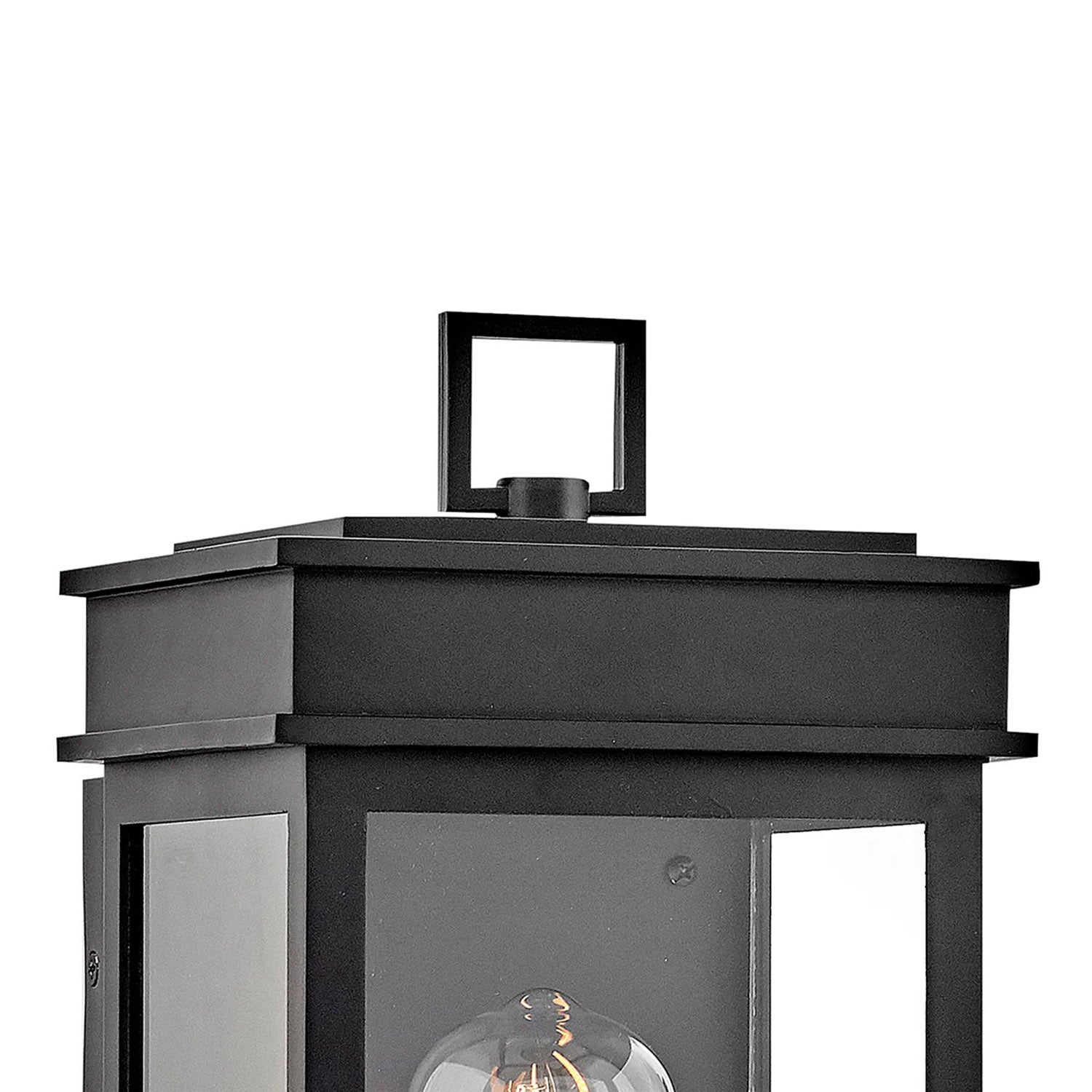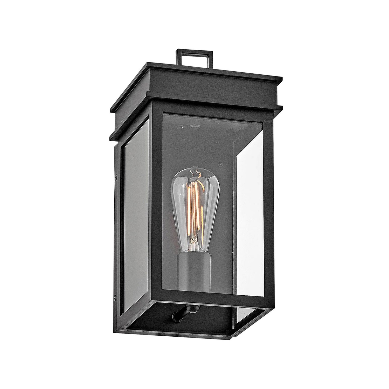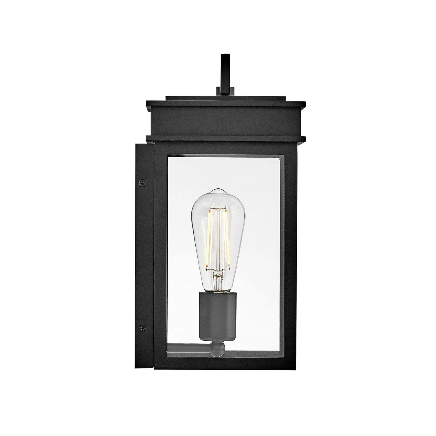 The Monterey Small Outdoor Wall Light is a classic exterior lantern that features a charming, traditional style with its clean lines and a distinctive top handle. The traditional rectangular frame and distinctive curved top bracket hold clear glass panels, creating a welcoming, familiar silhouette that showcases the exposed bulb. Crafted from durable materials, this fixture is built to withstand the elements, providing bright, welcoming illumination that enhances the safety and curb appeal of your home. With its ETL wet rating, this outdoor light fixture is a perfect solution for any entryway, porch, or exterior wall. The sophisticated Black finish delivers enduring, traditional style and a perfect blend of form and function.