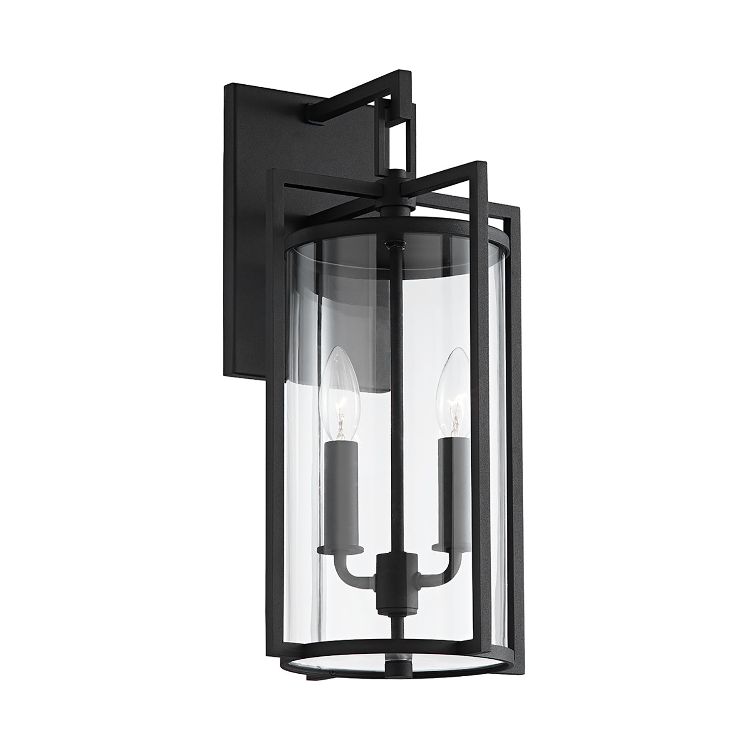 The Peyton Medium Outdoor Wall Light is a modern take on a traditional lantern, making a sophisticated statement with its clean lines and open cage design. The sturdy aluminum frame holds a clear glass cylinder, creating a refined silhouette that beautifully showcases the exposed candelabra bulbs. Designed to withstand the elements, this outdoor wall light provides bright, multi-directional illumination, enhancing the safety and curb appeal of your home. With its UL wet rating, it is a perfect solution for any entryway, garage, or exterior wall. The sophisticated finish, textured black, delivers enduring, traditional style and a perfect blend of form and function.