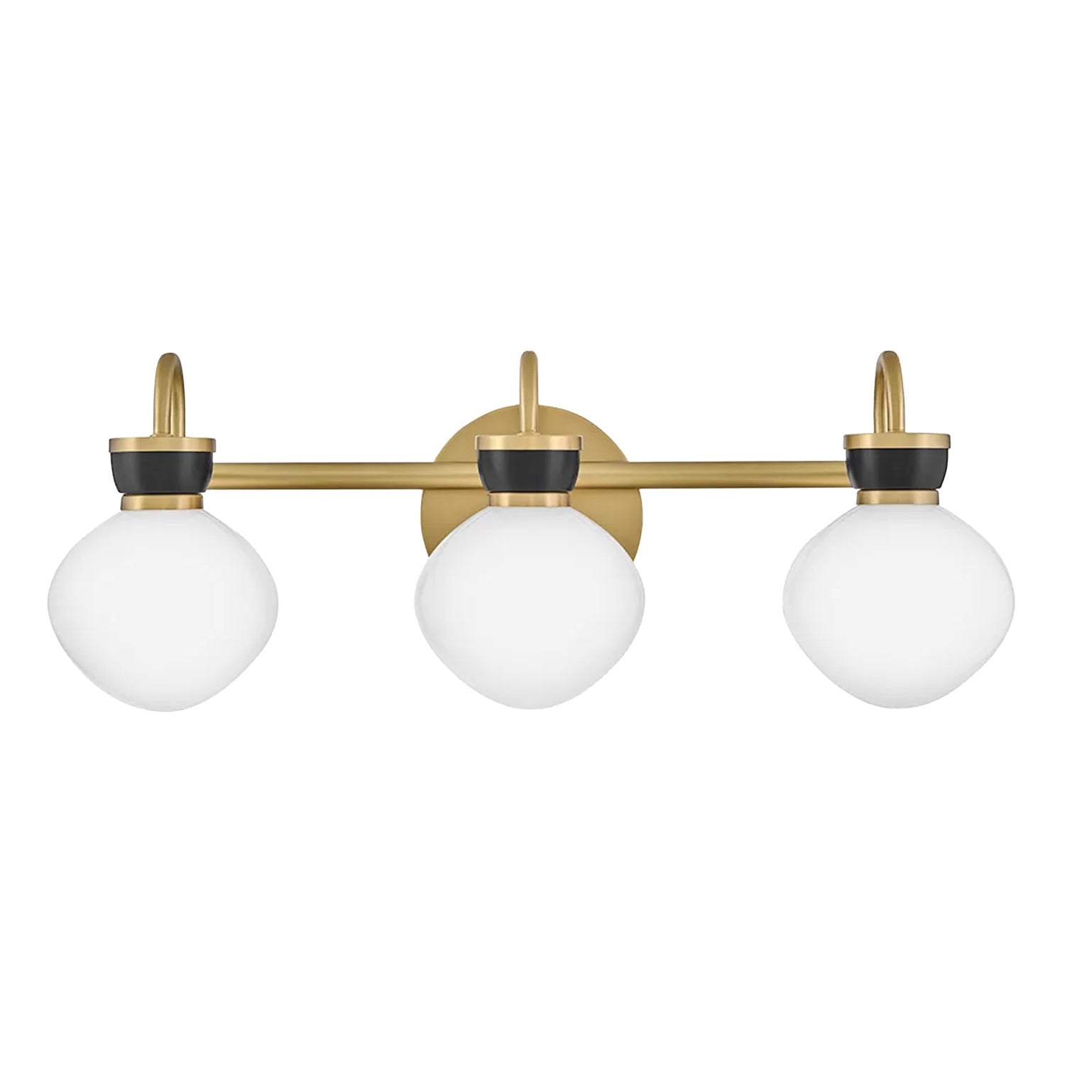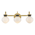 The Piper 3 Light Vanity makes a playful statement, defined by its bold, organic glass and elegant color contrast. This fixture features a softly curved arm and a unique opal glass globe, accented by a distinctive black cuff. The result is a warm, diffused glow that fills the space with elegant illumination, making this an ideal choice for a larger bathroom or double vanity. With its ETL damp rating, it offers both functional beauty and versatile appeal. The sophisticated two-toned finish of satin brass and black adds a touch of modern vibrancy, delivering enduring style and a perfect blend of elegance and simplicity.