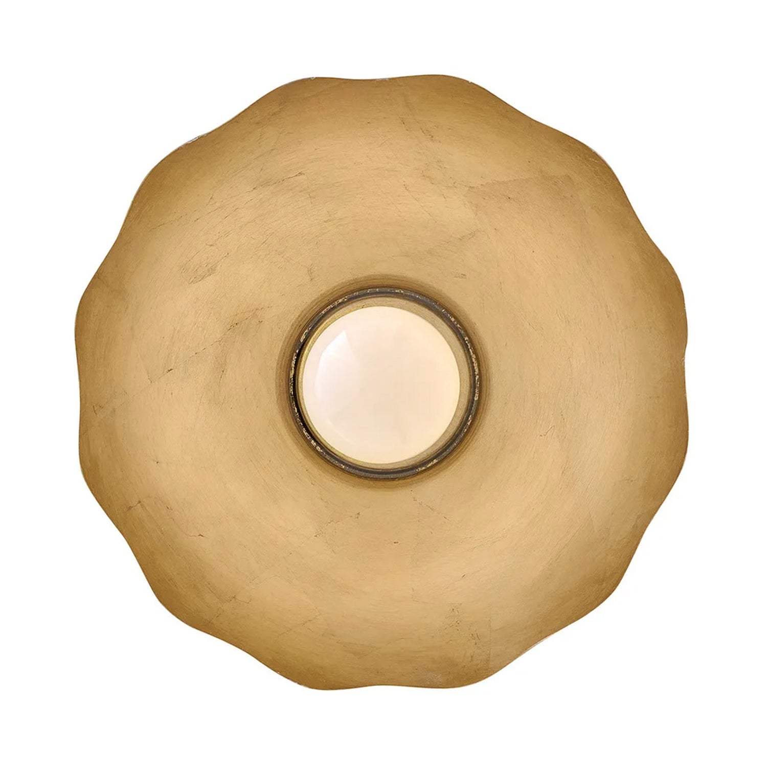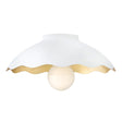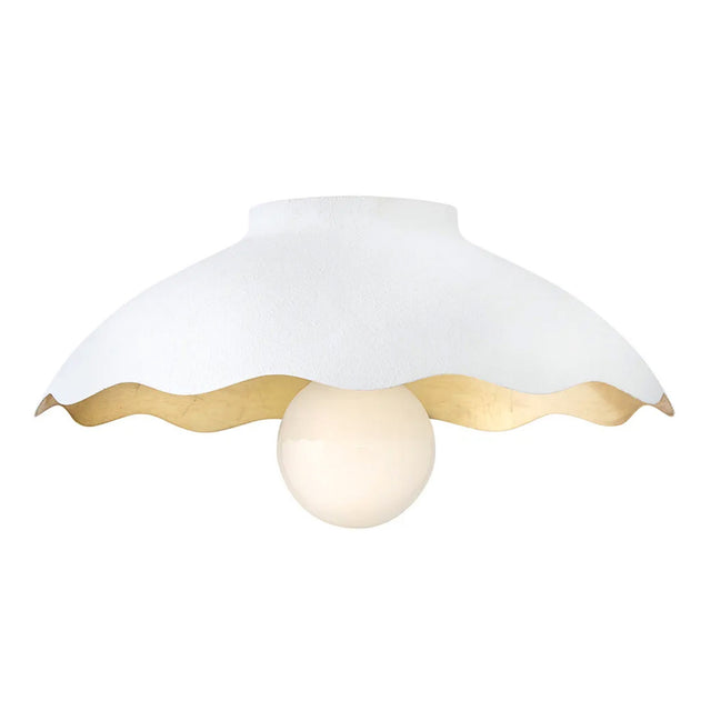 The Posey Flush Mount makes a playful, sculptural statement with its unique silhouette and bold color contrast. The defining feature is the wide, scalloped metal shade that creates an elegant, flared silhouette, centered by a single globe bulb. This fixture provides elegant, fully diffused light, making it an ideal choice for a bedroom, dining area, or entryway. With its ETL dry rating, it offers both functional beauty and versatile appeal. The two-toned finish features a crisp Textured White exterior contrasted with warm Rustic Brass accents, resulting in a look of enduring style and timeless elegance. This striking collection delivers enduring style and a perfect blend of elegance and simplicity.