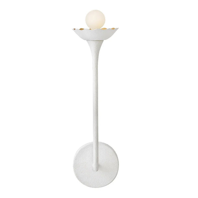 The Posey Wall Sconce makes a playful, sculptural statement with its unique silhouette and bold color contrast. The defining feature is the wide, scalloped metal shade that creates an elegant, flared silhouette, centered by a single globe bulb. This fixture is thoughtfully designed to add a layer of functional, inviting light to a hallway, bedroom, or bathroom vanity. With its ETL damp rating, it offers both functional beauty and versatile appeal. The two-toned finish features a crisp Textured White exterior contrasted with warm Rustic Brass accents, resulting in a look of enduring style and timeless elegance. This striking collection delivers enduring style and a perfect blend of elegance and simplicity.