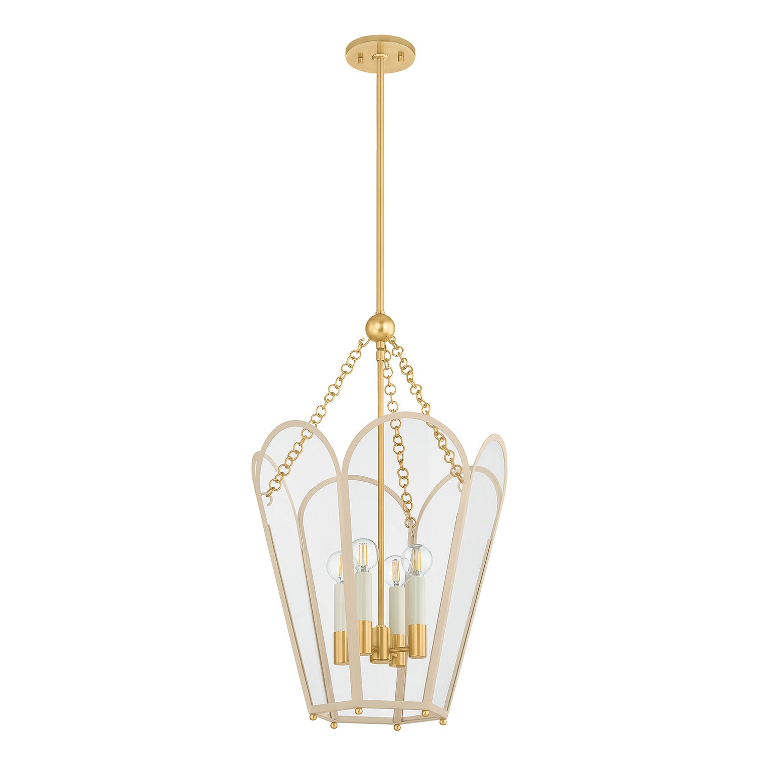 • Ravenna Pendant features a six-sided cream metal frame with clear glass panels and aged brass accents for a fresh, elegant look