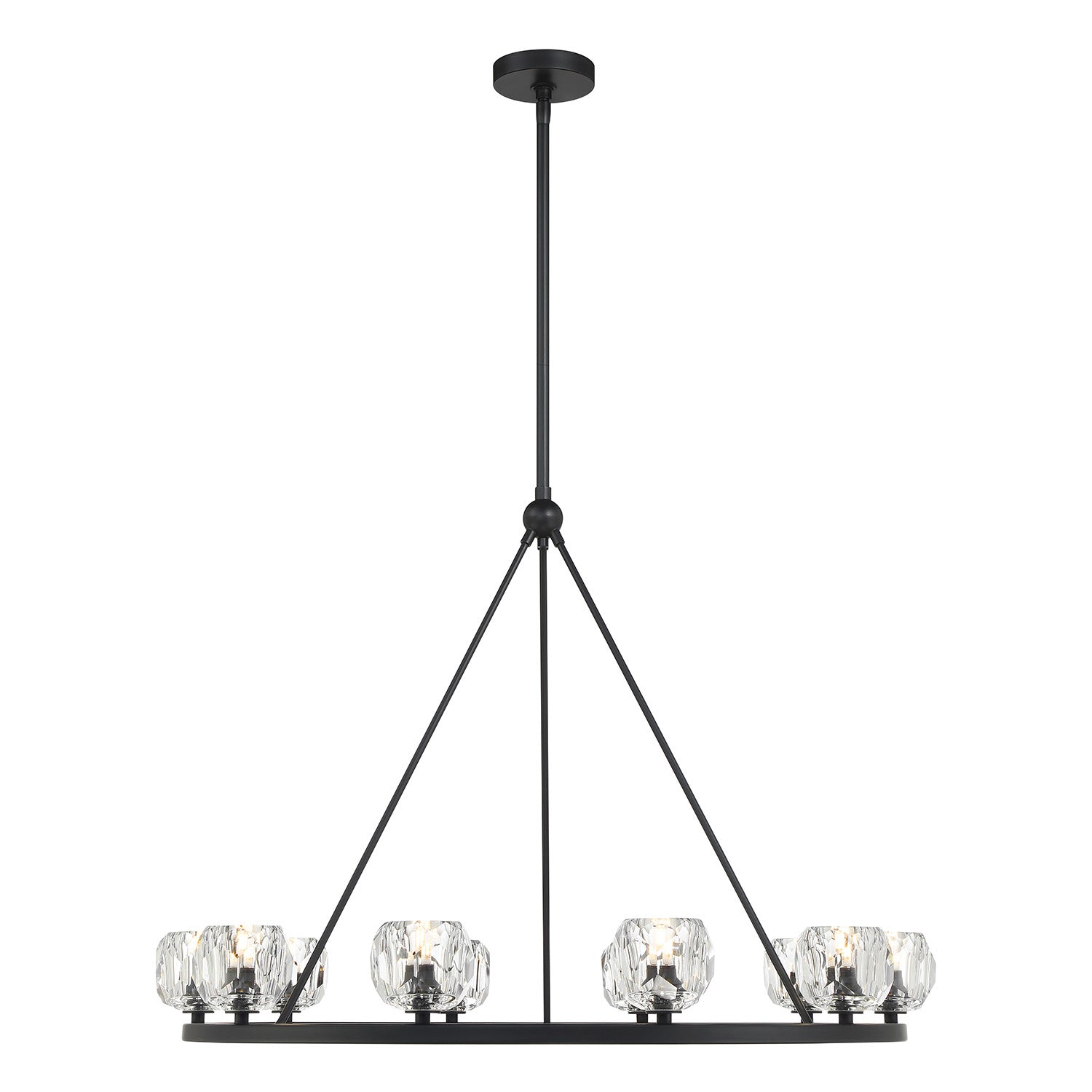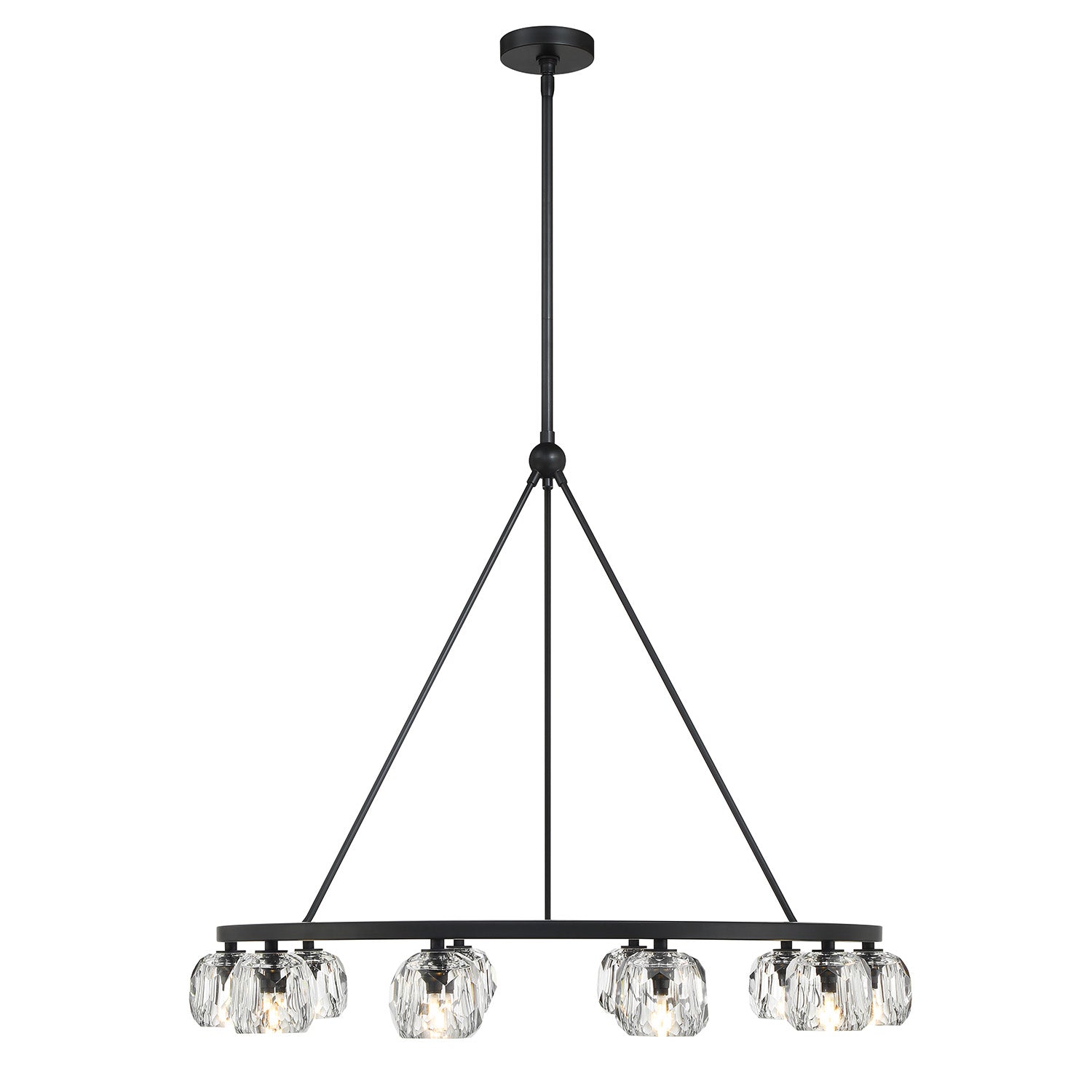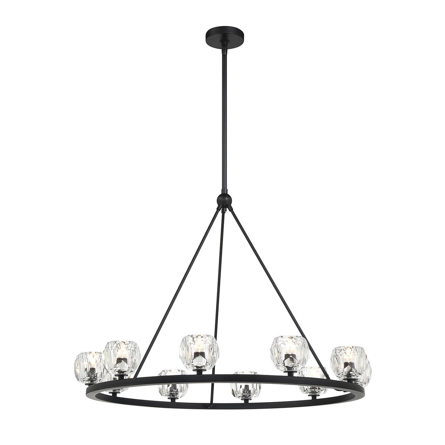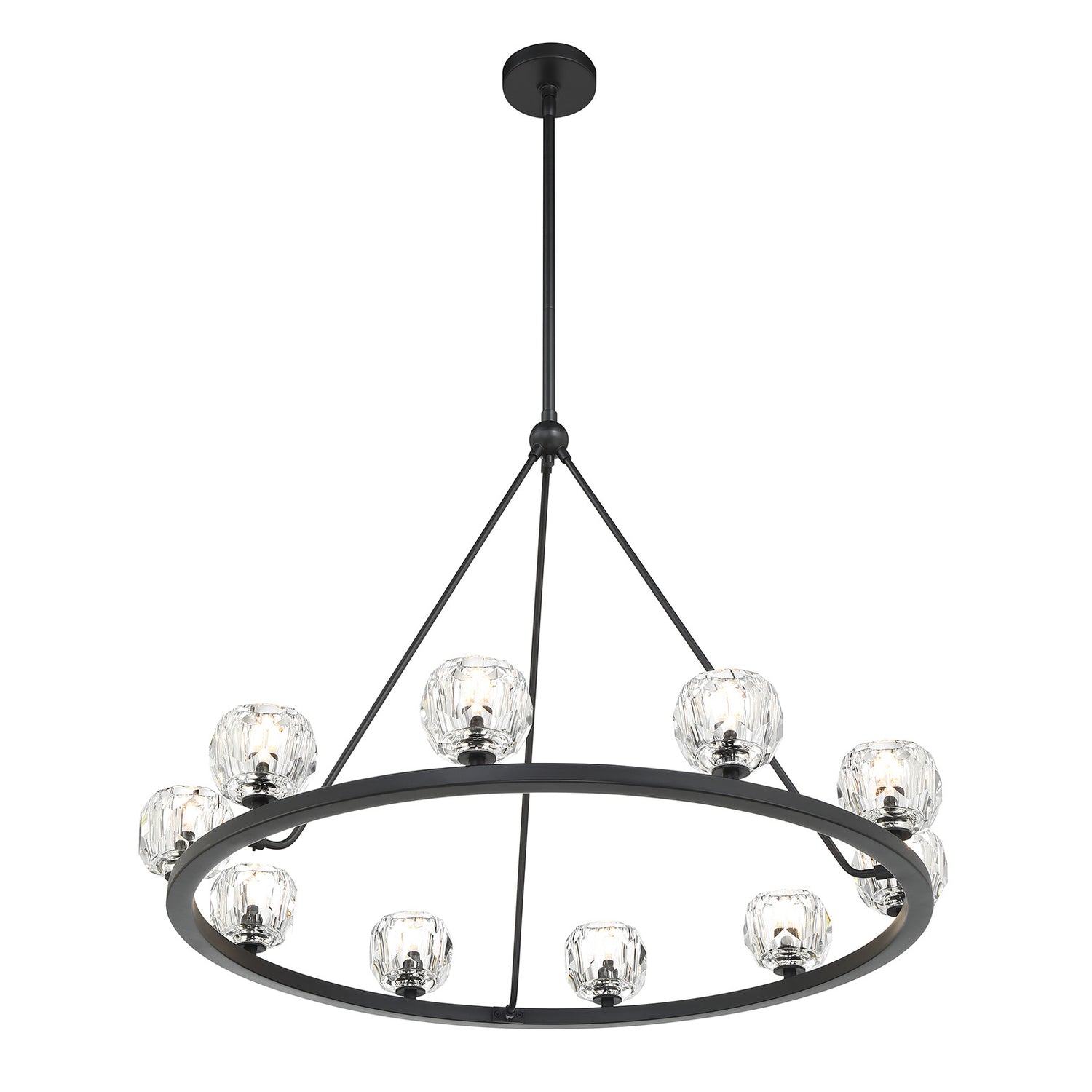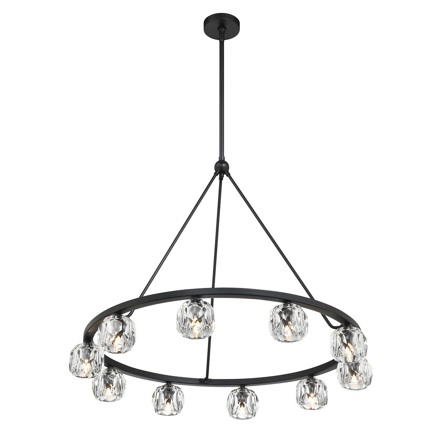 • Silas features a single-tiered round metal frame paired with 12 hand-cut faceted crystal globes for a refined and industrial look