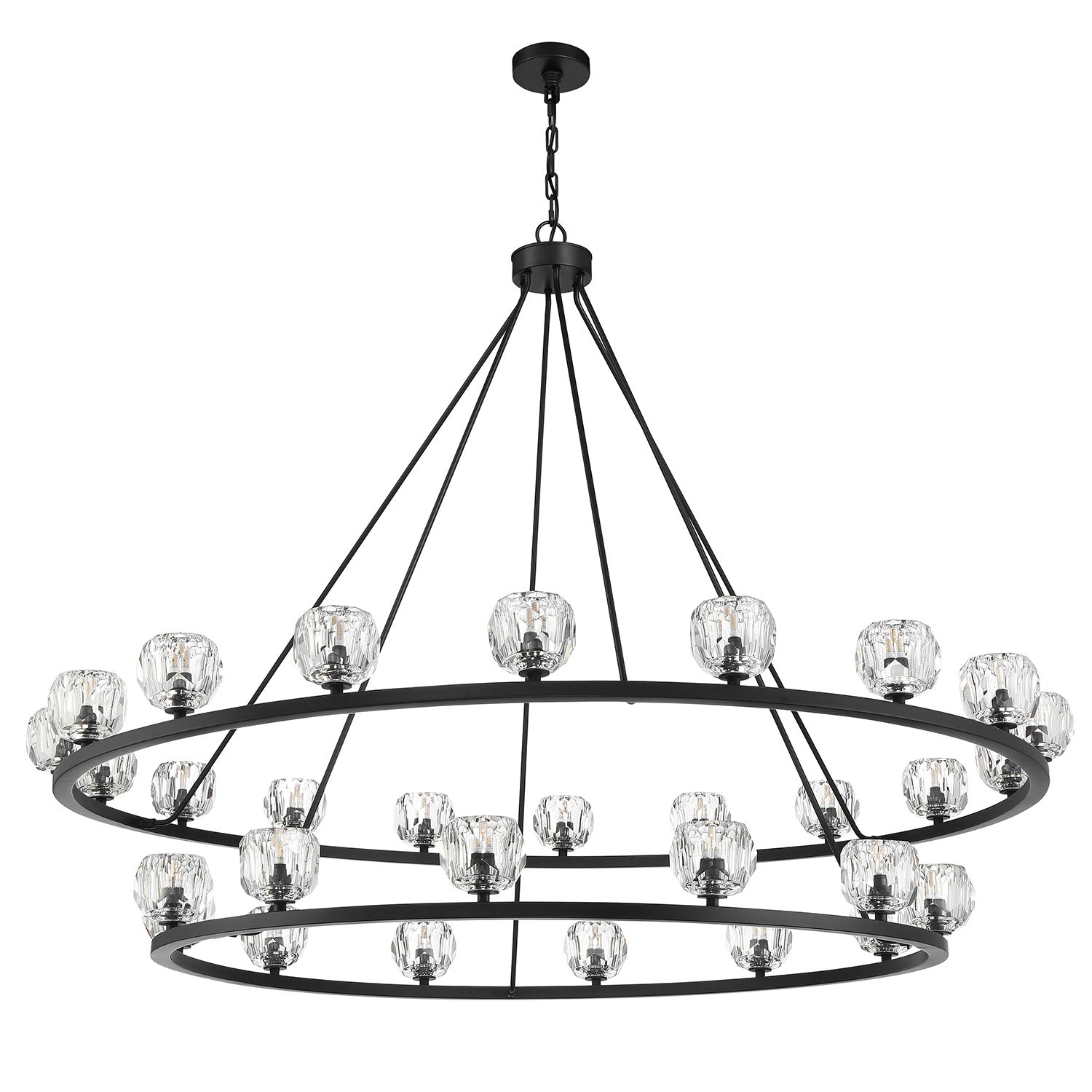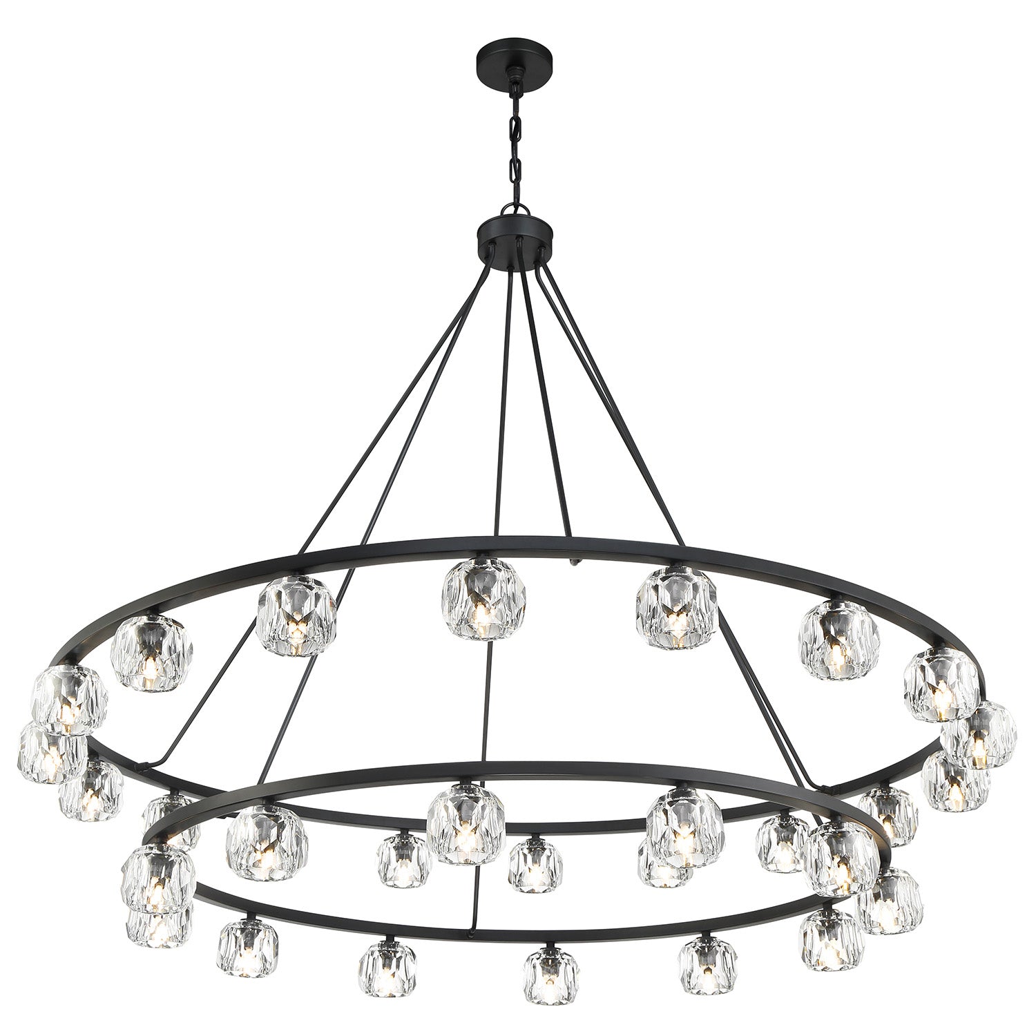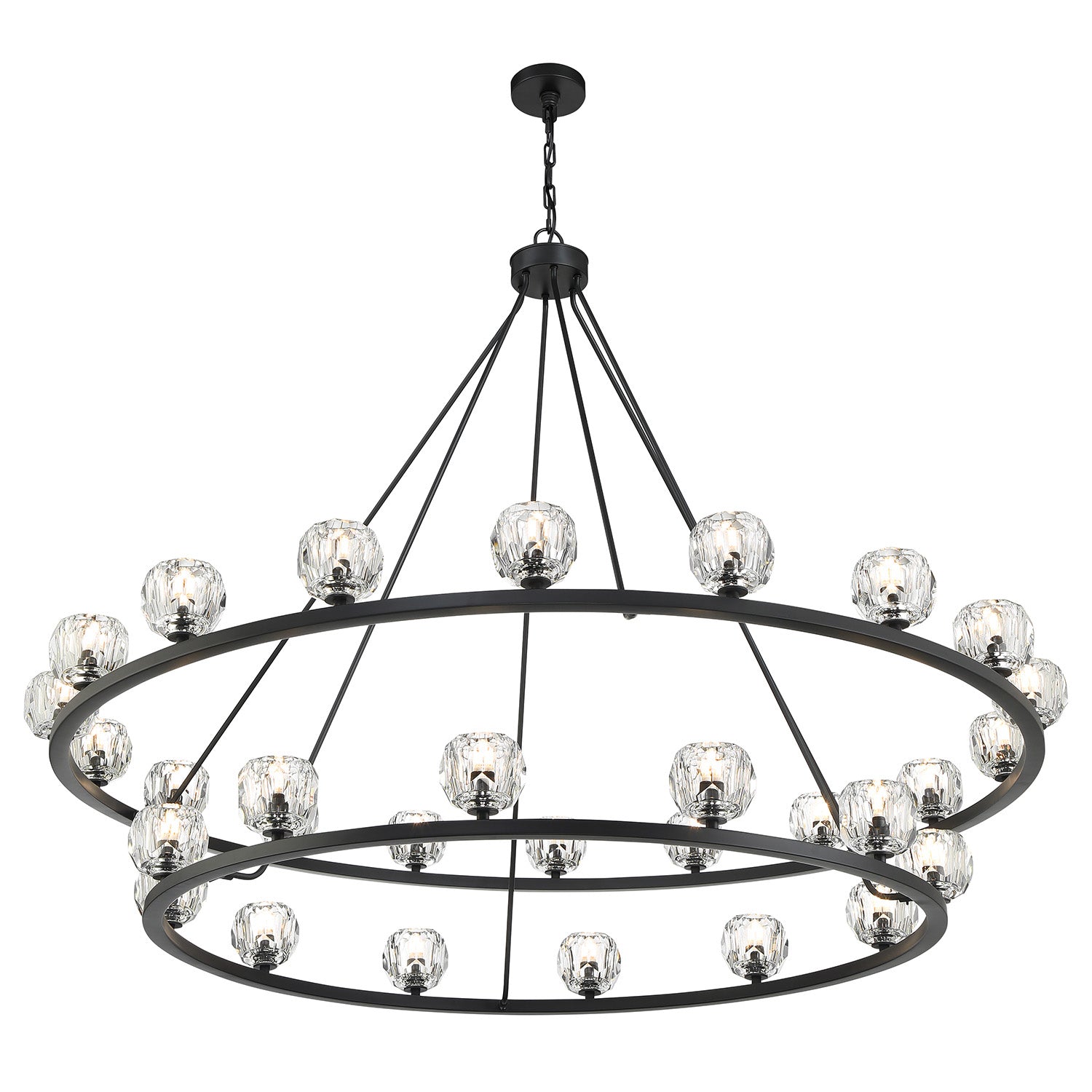 The Silas 30 Light Two-Tier Ring Chandelier 60" elevates minimalist lighting through the use of luxurious materials and a refined finish. This fixture artfully balances a grand architectural presence with the delicate, brilliant beauty of hand-cut crystal. The design features a double-tiered frame meticulously crafted with sleek rods that support premium faceted crystal globes. Functionally timeless, it provides exceptional flexibility, as it can be hung with either upward or downward-facing light to perfectly set the mood of any expansive room. The Matte Black finish adds a bold layer of modern elegance, creating a sharp contrast that emphasizes the shimmering refraction of the faceted crystal.