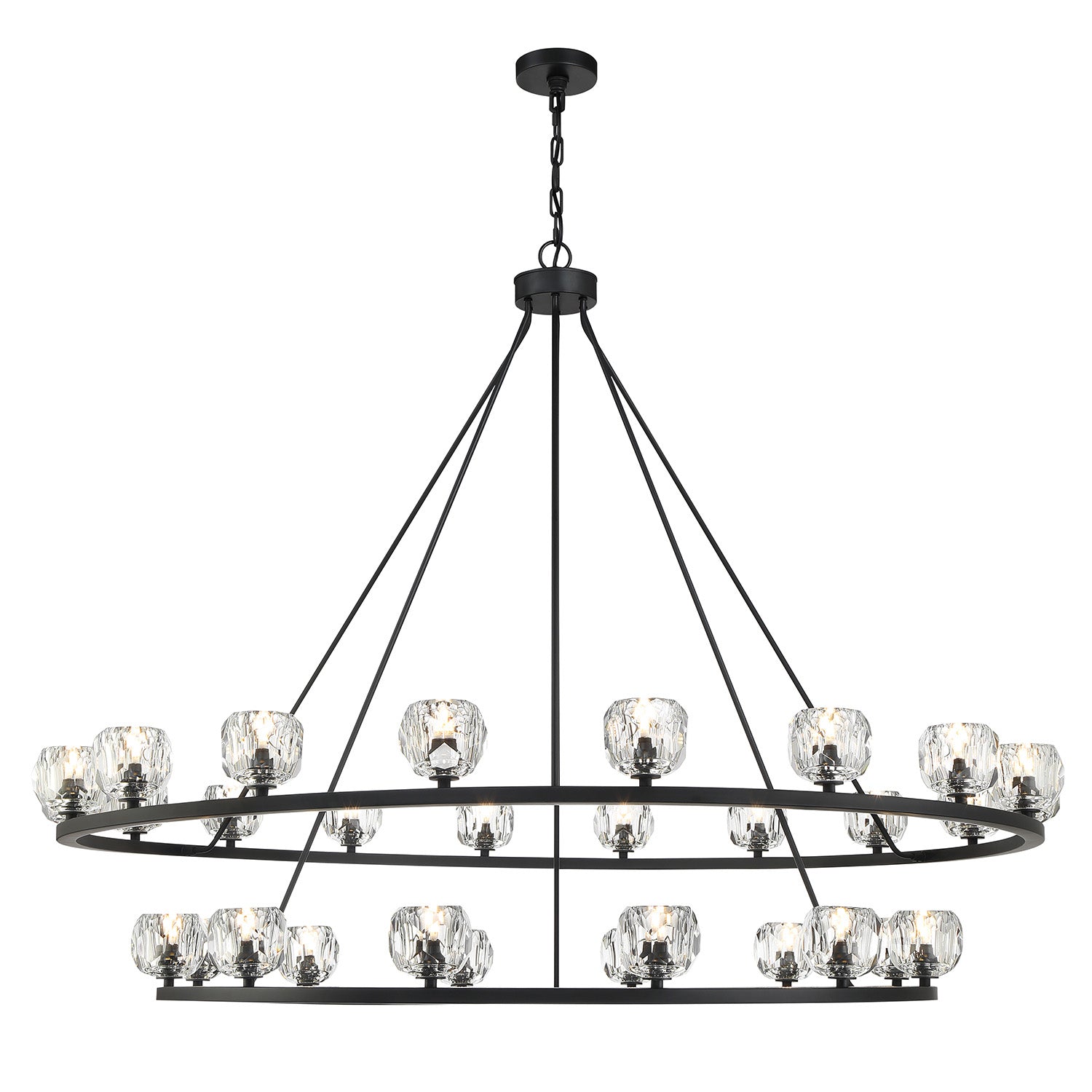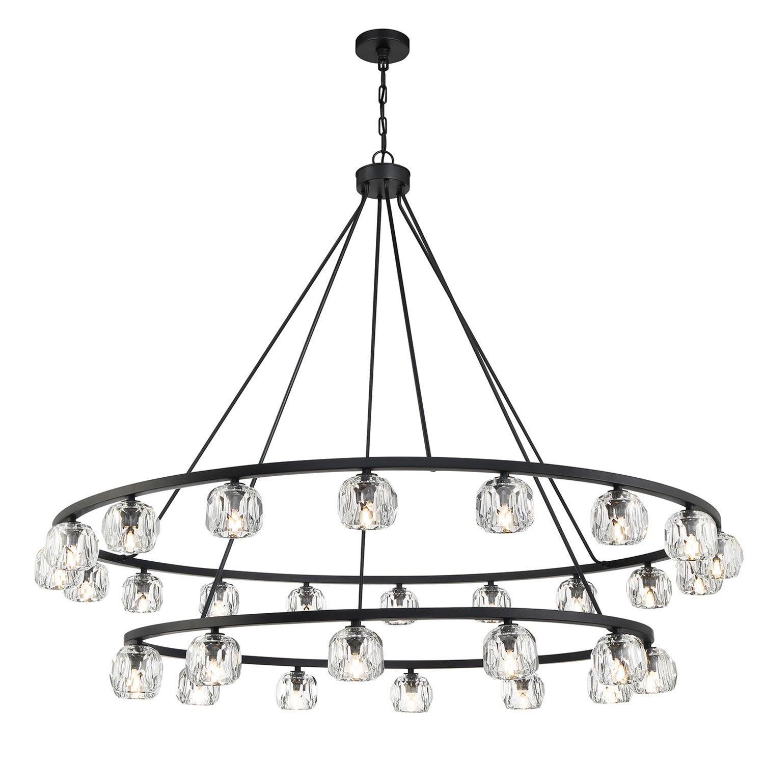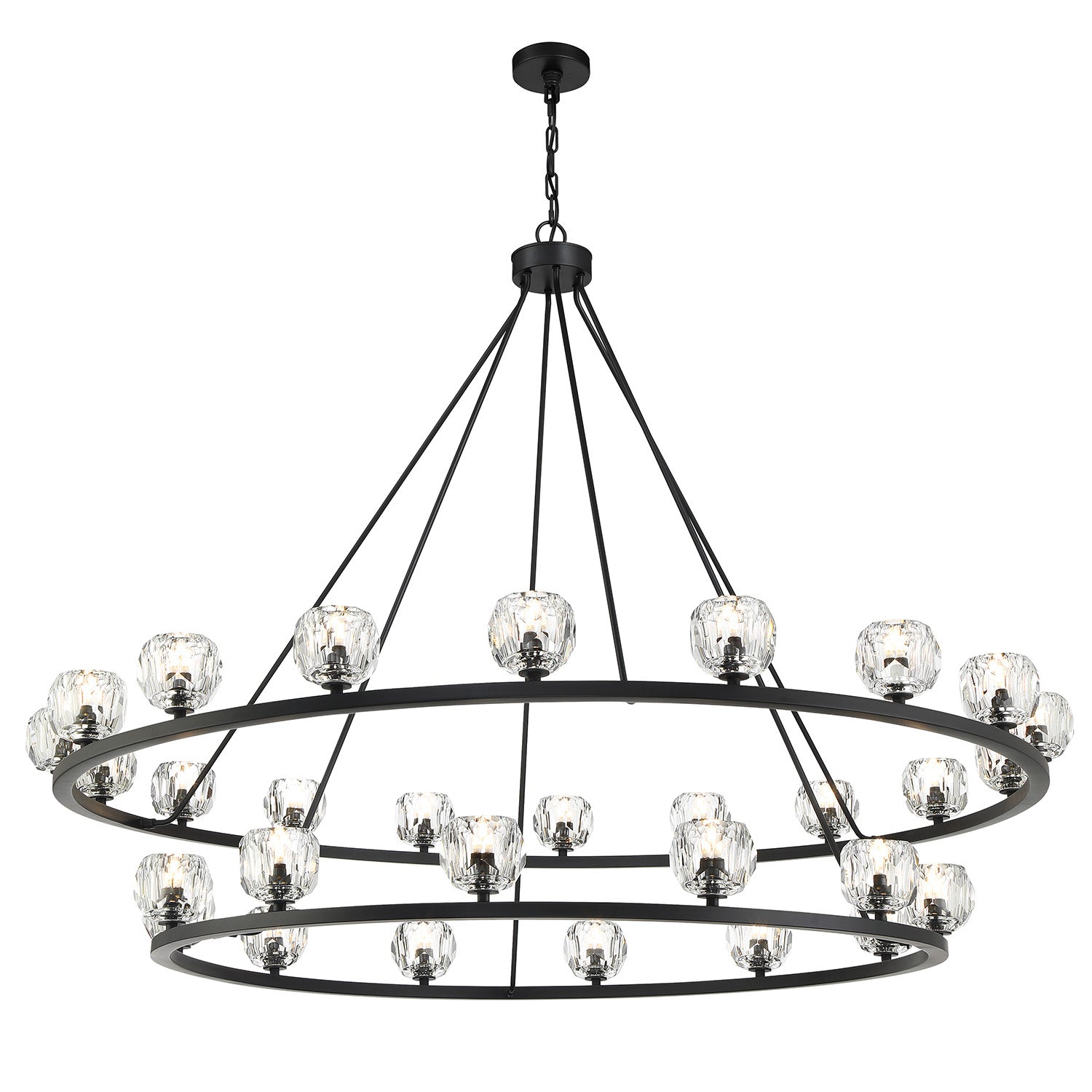 The Silas 30 Light Two-Tier Ring Chandelier 60" elevates minimalist lighting through the use of luxurious materials and a refined finish. This fixture artfully balances a grand architectural presence with the delicate, brilliant beauty of hand-cut crystal. The design features a double-tiered frame meticulously crafted with sleek rods that support premium faceted crystal globes. Functionally timeless, it provides exceptional flexibility, as it can be hung with either upward or downward-facing light to perfectly set the mood of any expansive room. The Matte Black finish adds a bold layer of modern elegance, creating a sharp contrast that emphasizes the shimmering refraction of the faceted crystal.