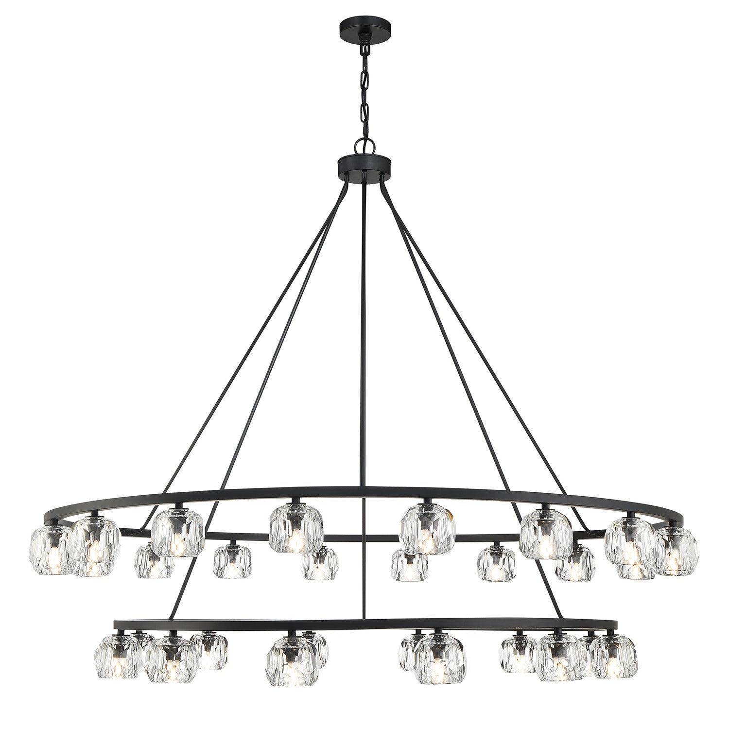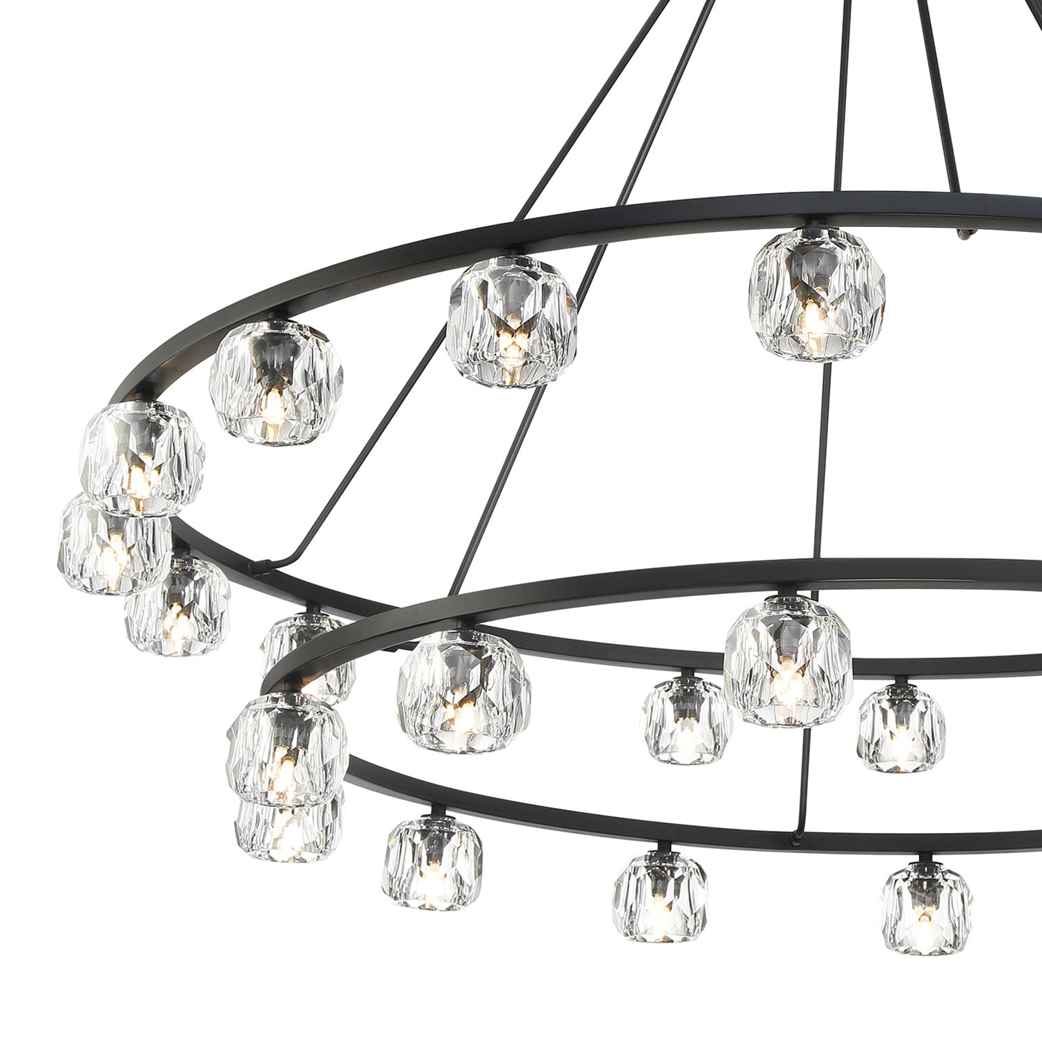 • Silas features a two-tiered round metal frame paired with 30 hand-cut faceted crystal globes for a refined and industrial look