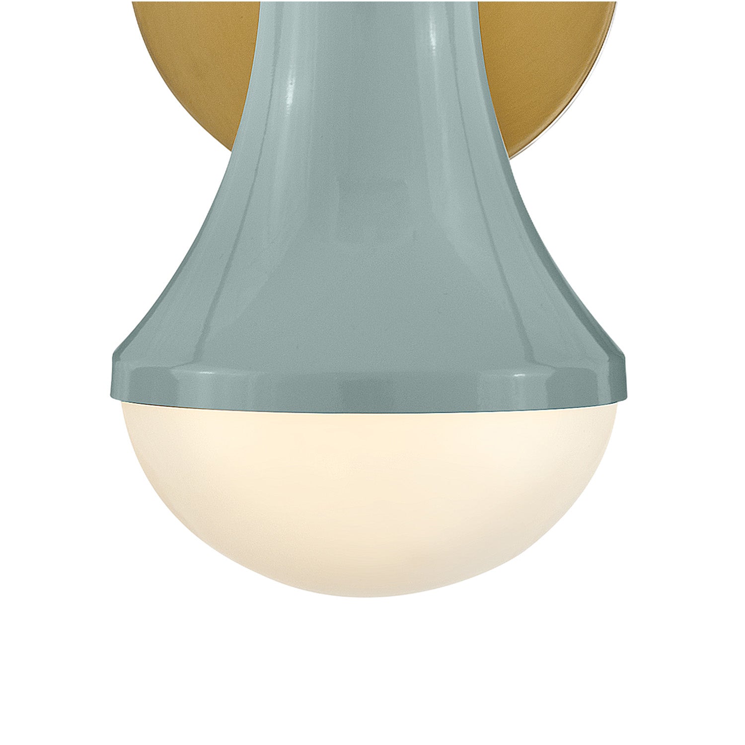 • Three-light vanity fixture with a unique, teardrop silhouette, aquaverde and brass finish, and opal glass diffusers