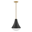 • Teardrop shade with a seamless satin brass and black metal top and opal glass diffuser provides soft, warm ambient illumination