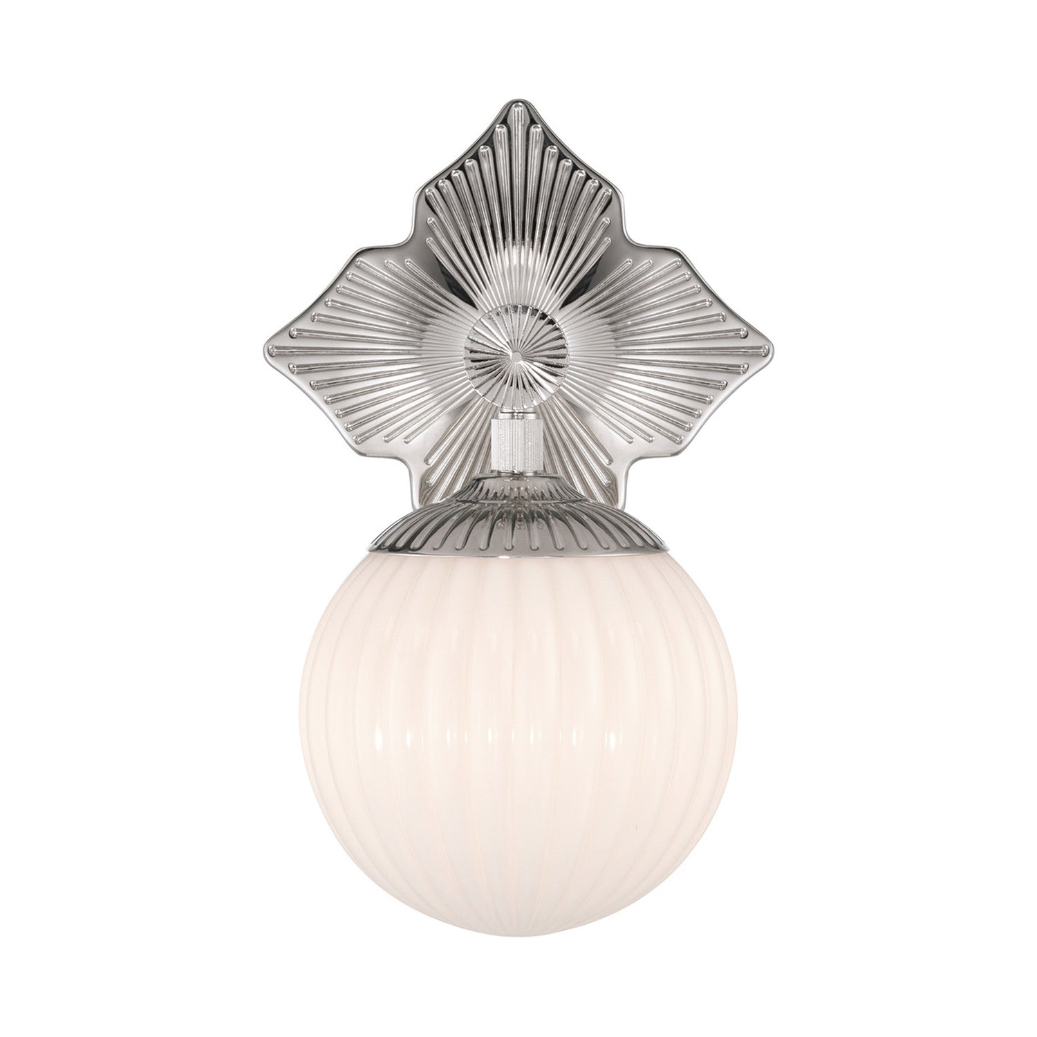 The Victoria Wall Sconce 12" is distinguished by an opal ribbed glass globe that adds texture, dimension, and a softly diffused glow. With a balance of sculptural form and refined detailing, these fixtures bring versatile sophistication to a variety of interiors. The striking Polished Nickel finish highlights the crisp architectural details of the quatrefoil backplate, offering a fresh and modern design perspective. This single-light sconce is an ideal choice for adding a touch of tailored elegance to hallways, bedrooms, or living spaces.