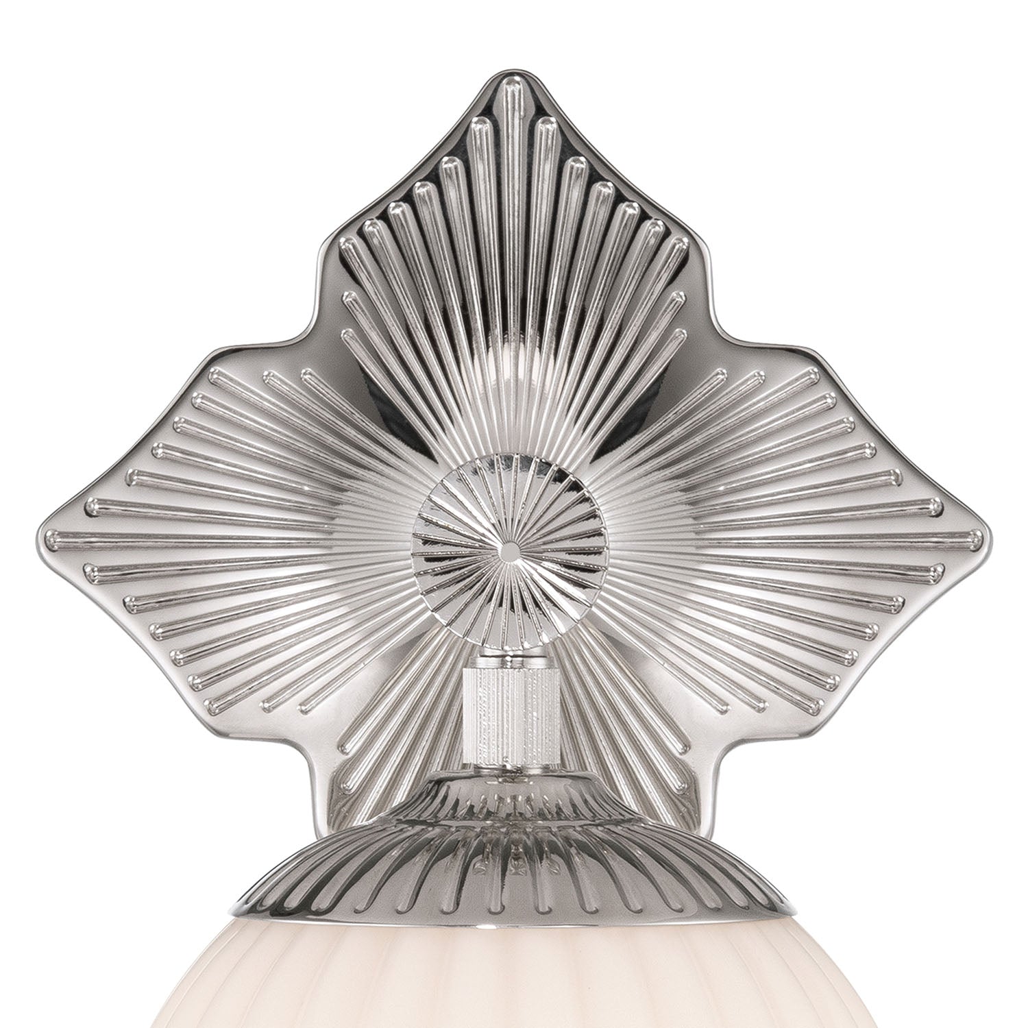 • Features an opal ribbed glass globe paired with a detailed, deco-inspired quatrefoil backplate