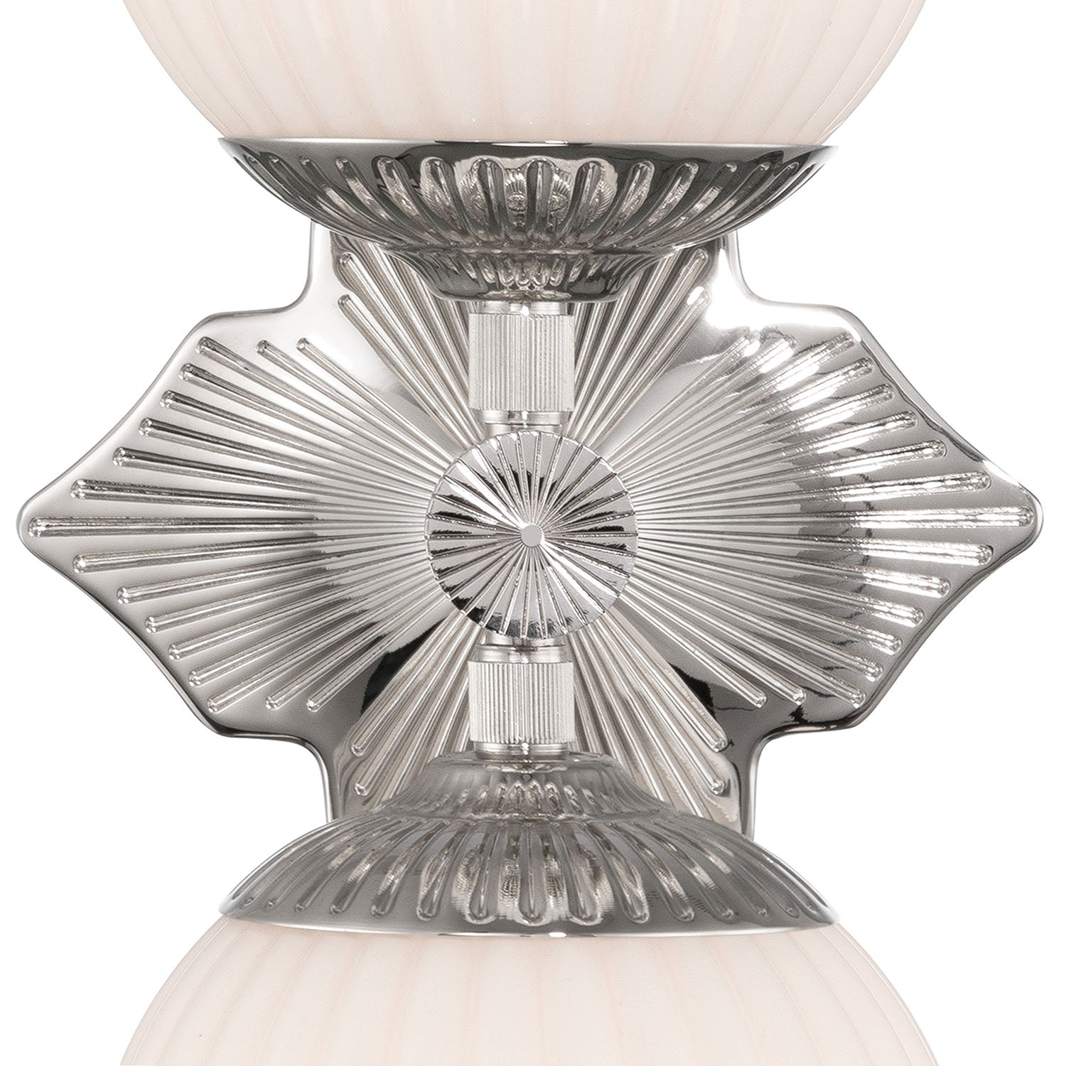 • Features two opal ribbed glass globes paired with a sculptural deco-inspired quatrefoil backplate