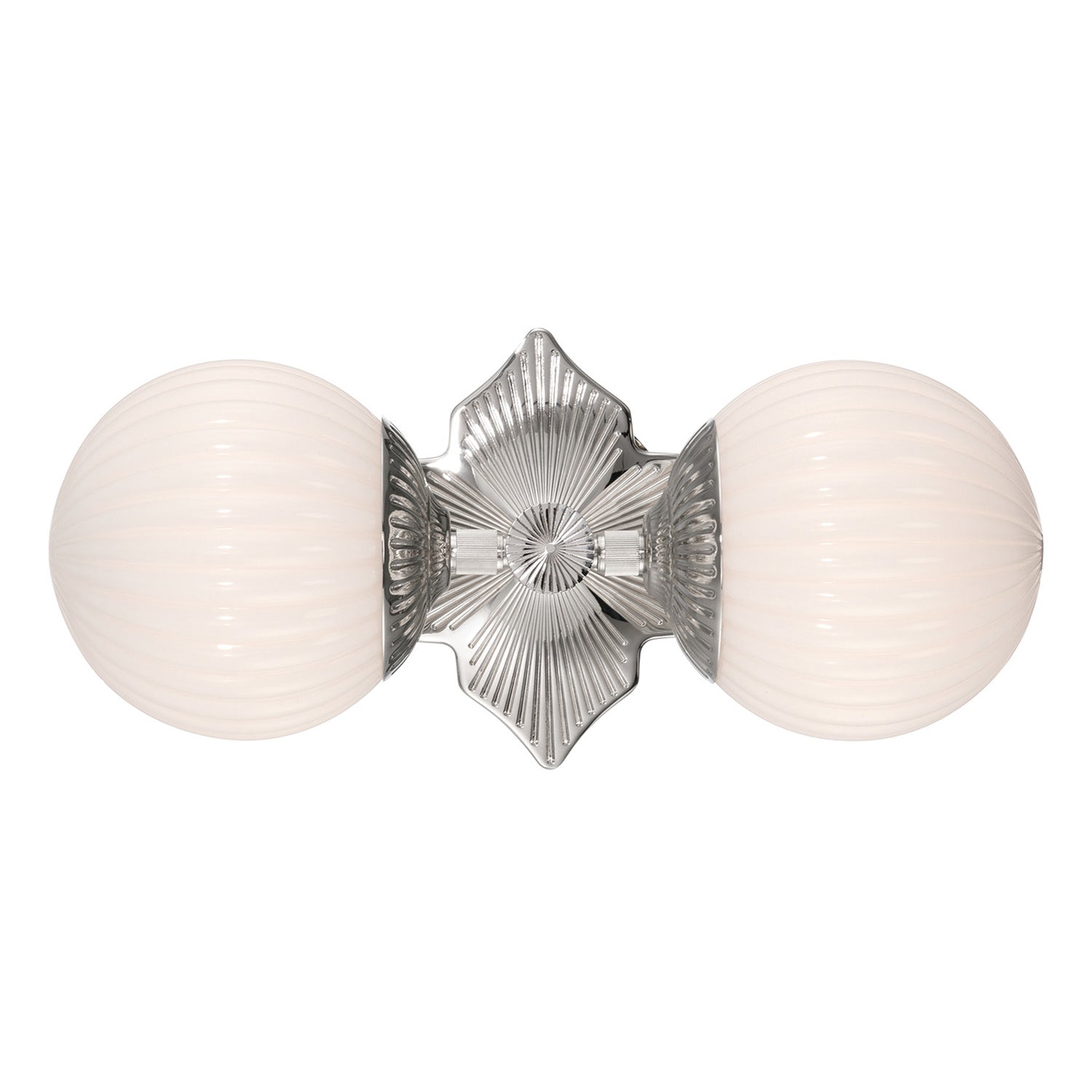 The Victoria 2 Light Wall Sconce 16" is distinguished by opal ribbed glass globes that add texture, dimension, and a softly diffused glow. With a balance of sculptural form and refined detailing, these fixtures bring versatile sophistication to a variety of interiors. The striking Polished Nickel finish highlights the crisp architectural details of the sculptural, quatrefoil backplate, offering a fresh and modern design perspective. This two-light sconce is an ideal choice for adding a touch of tailored elegance to bathrooms, vanities, or living spaces.