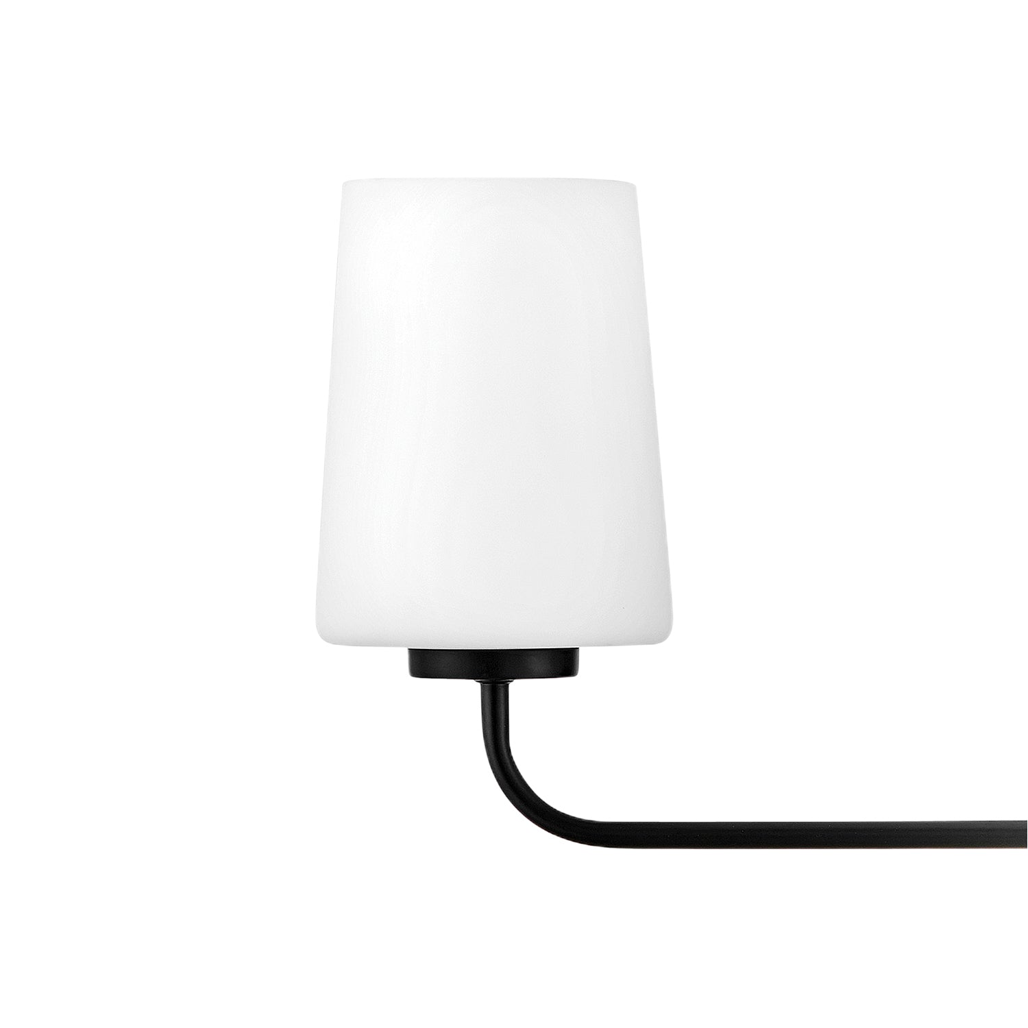 • Bell-shaped milk glass shades provide a soft, diffused glow, beautifully contrasted by the sleek black finish