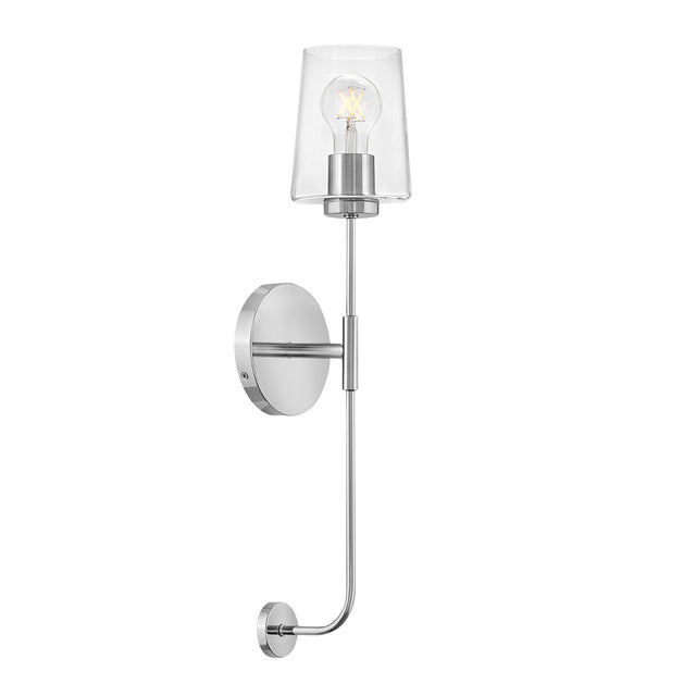 The Wyatt Wall Sconce 23" makes a sophisticated statement, defined by its elegant contrast and minimalist style. The tall, single arm features a gentle curve, supporting a transparent, bell-shaped Clear Glass shade that provides brilliant, focused light. This fixture is thoughtfully designed to add a layer of functional illumination to any interior space, perfect for a hallway, living area, or flanking artwork. With its ETL dry rating, it offers both functional beauty and versatile appeal. The brilliant Chrome finish enhances the clarity of the clear glass, resulting in a refined and timeless look. This striking collection delivers enduring style and a perfect blend of elegance and simplicity.