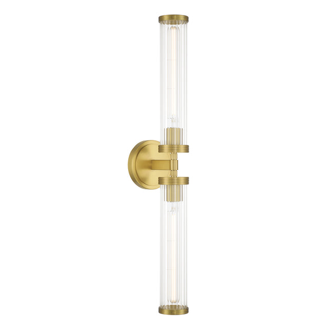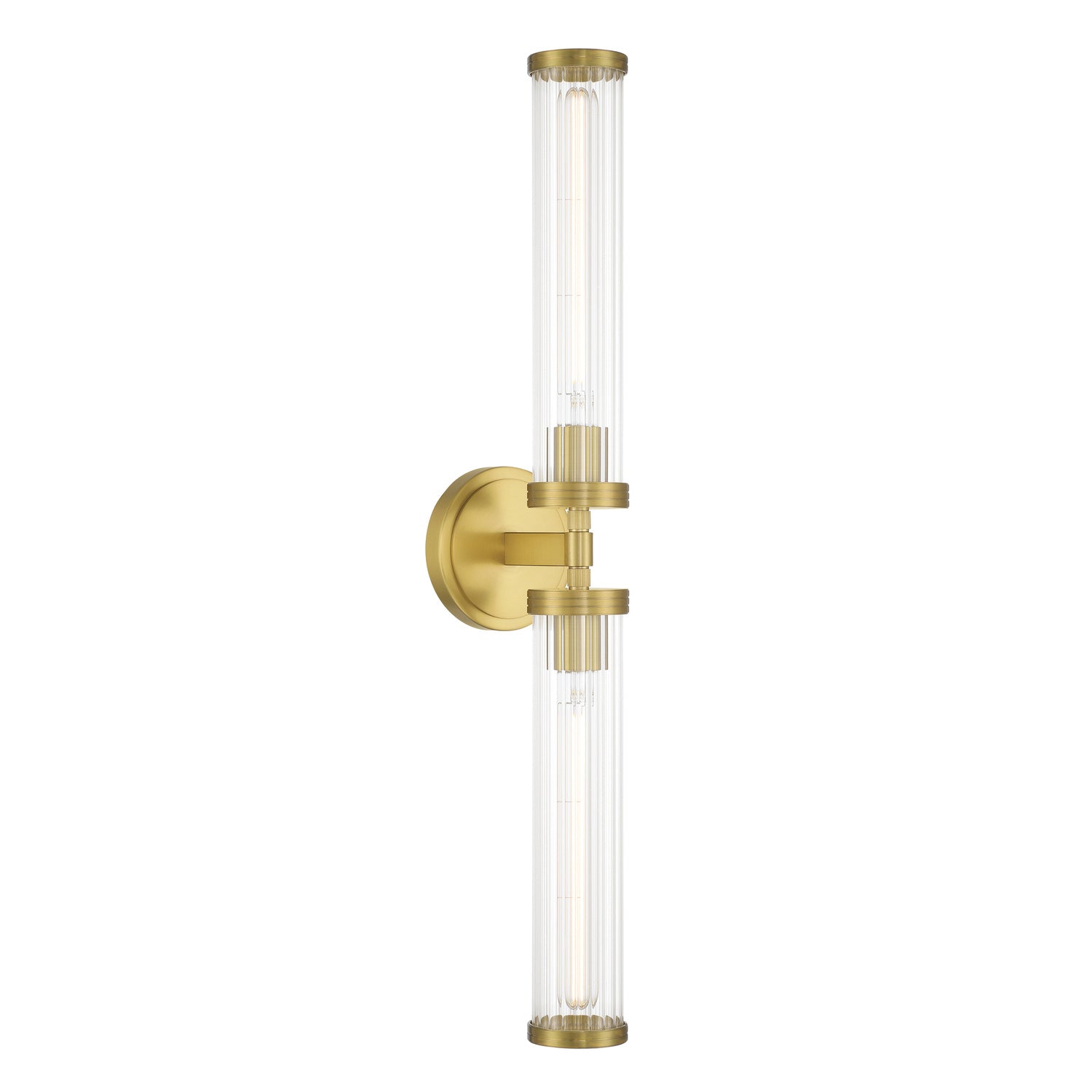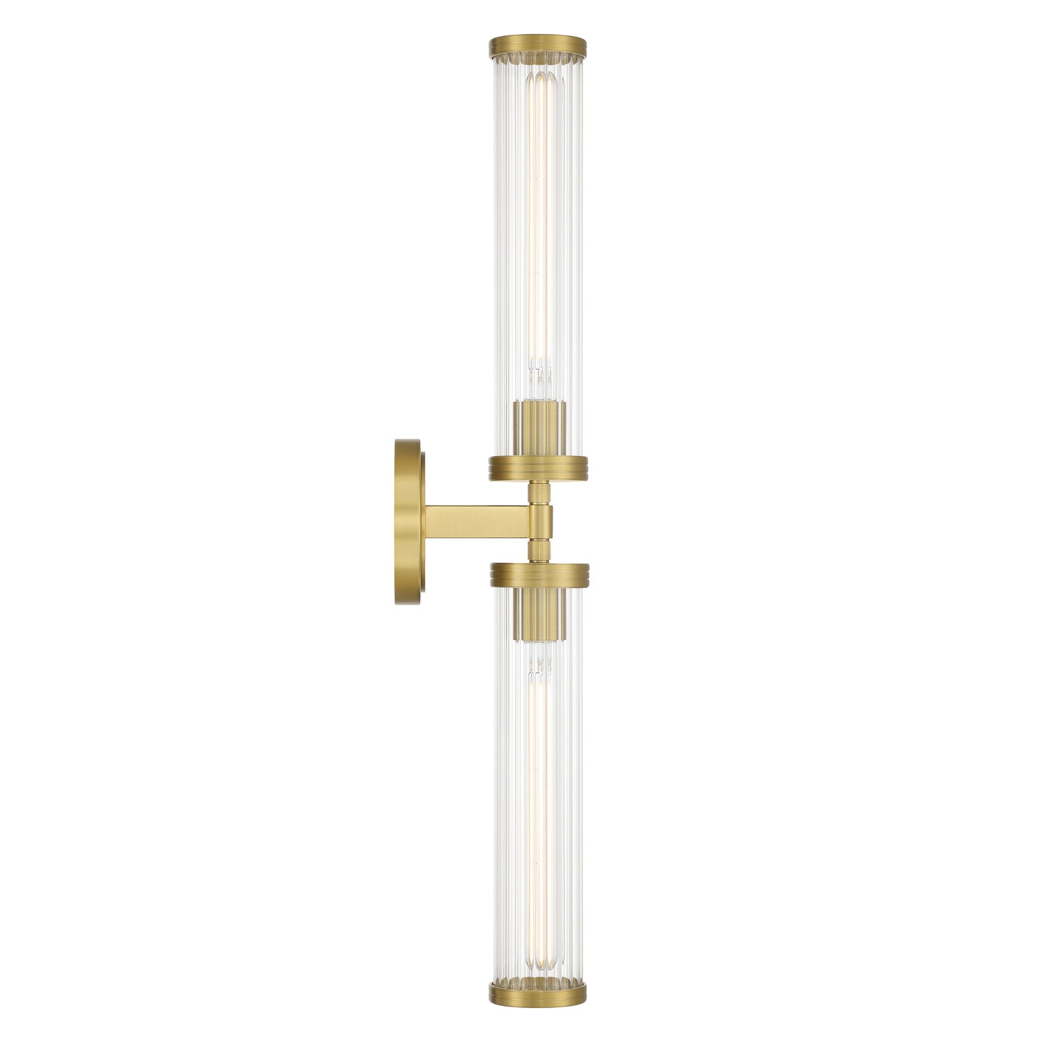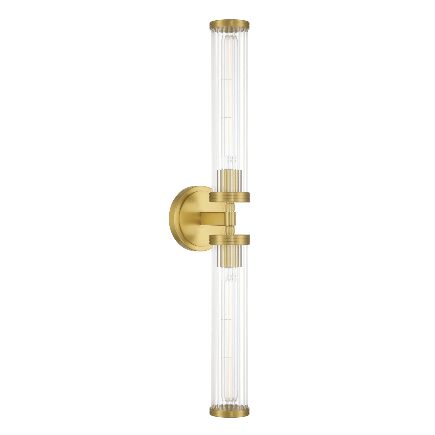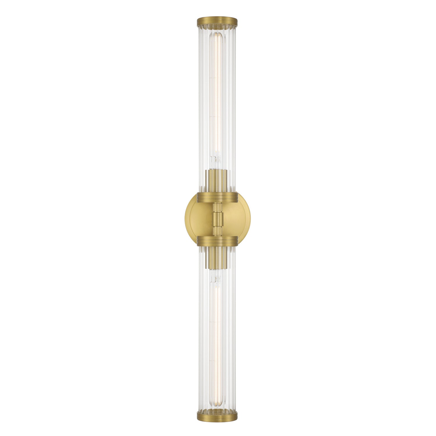 The Dexter 2 Light Wall Sconce 29" features a sleek, modern design with clean lines and vertical ribbed glass that enhances light diffusion. This collection combines form and function, offering a versatile lighting solution suited for various residential and commercial applications. Its refined, minimalist structure ensures it integrates seamlessly into contemporary and transitional spaces. Crafted with a striking Aged Brass frame and elegant glass cylinders, the fixture provides a sophisticated, multi-directional glow. With its UL damp rating, the Dexter sconce is an ideal choice for adding a layer of architectural light to a bathroom vanity, hallway, or modern interior.