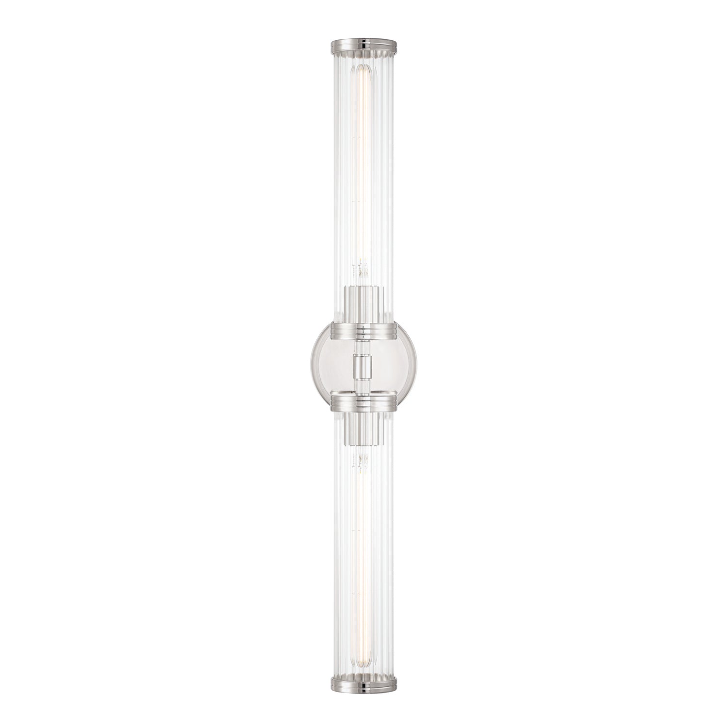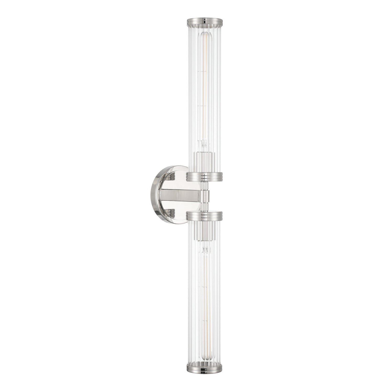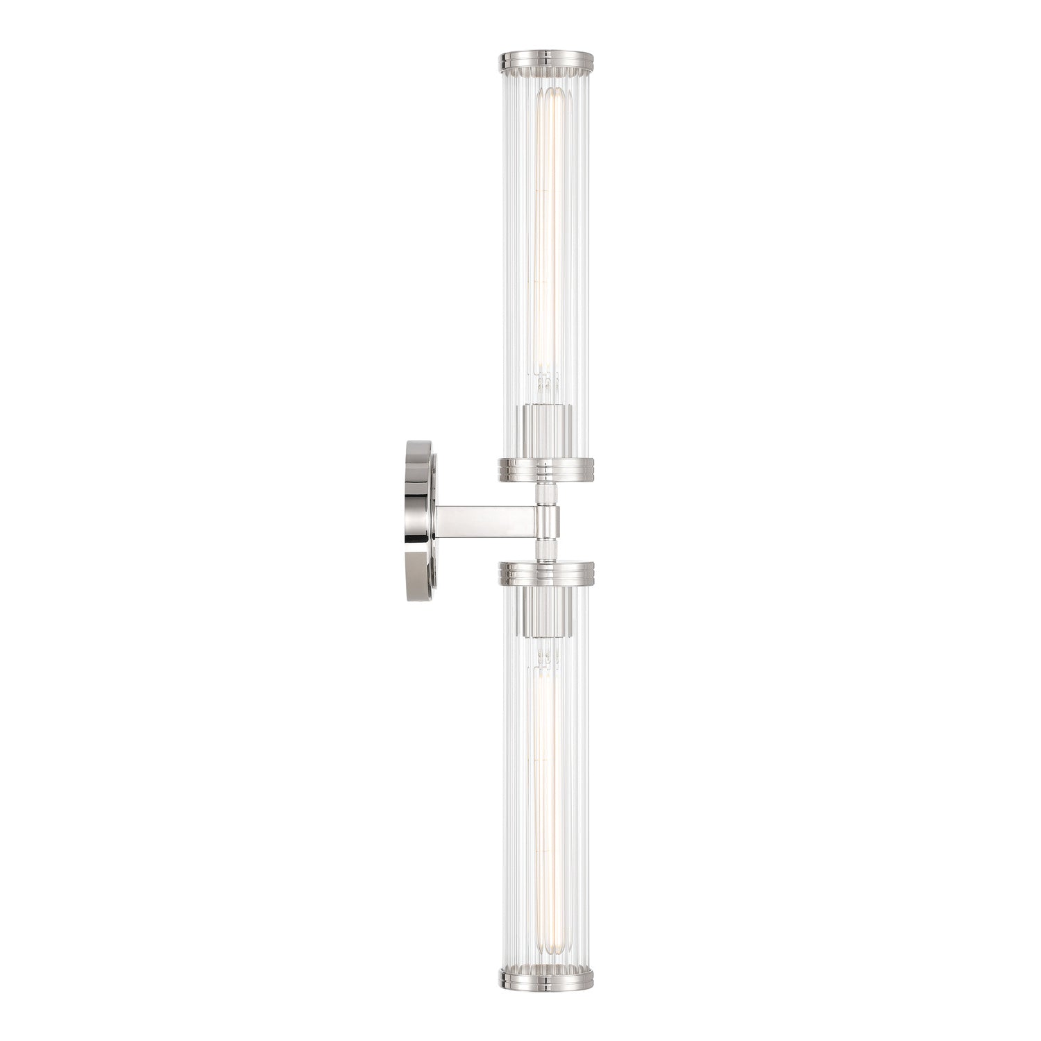 The Dexter 2 Light Wall Sconce 29" features a sleek, modern design with clean lines and vertical ribbed glass that enhances light diffusion. This collection combines form and function, offering a versatile lighting solution suited for various residential and commercial applications. Its refined, minimalist structure ensures it integrates seamlessly into contemporary and transitional spaces. Crafted with a striking Polished Nickel frame and elegant glass cylinders, the fixture provides a clean, sophisticated glow. With its UL damp rating, the Dexter sconce is an ideal choice for adding a layer of architectural light to a bathroom vanity, hallway, or modern interior.
