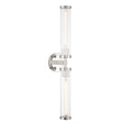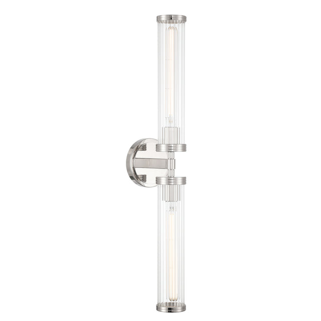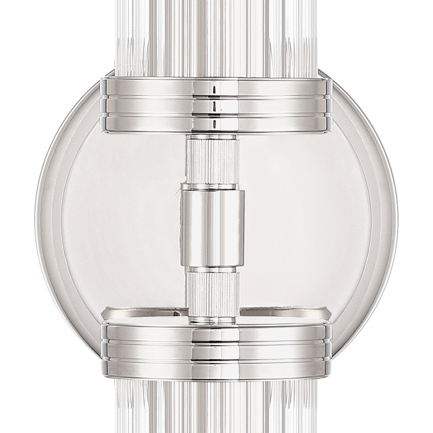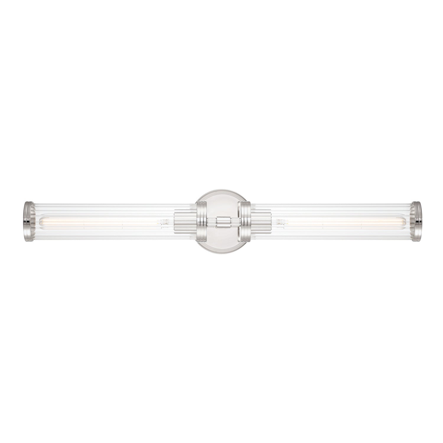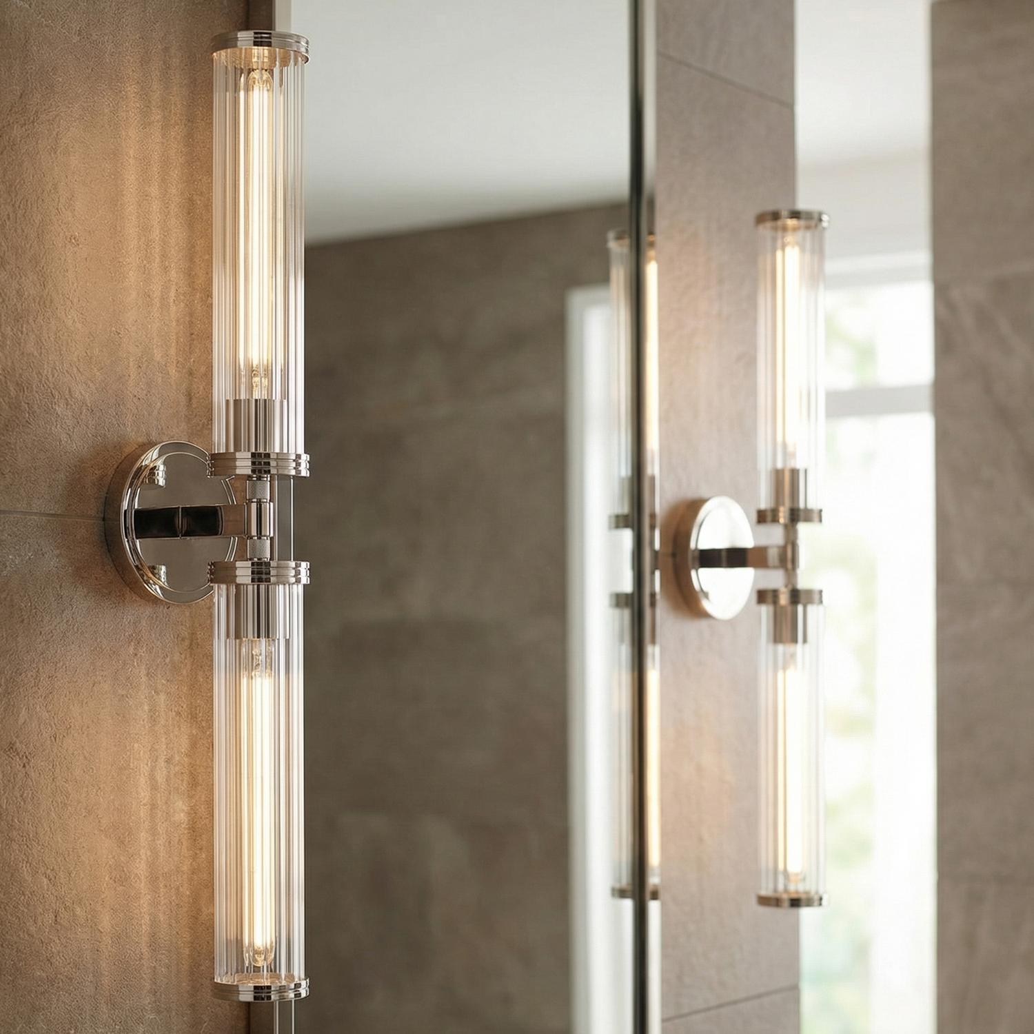 The Dexter 2 Light Wall Sconce 29" features a sleek, modern design with clean lines and vertical ribbed glass that enhances light diffusion. This collection combines form and function, offering a versatile lighting solution suited for various residential and commercial applications. Its refined, minimalist structure ensures it integrates seamlessly into contemporary and transitional spaces. Crafted with a striking Polished Nickel frame and elegant glass cylinders, the fixture provides a clean, sophisticated glow. With its UL damp rating, the Dexter sconce is an ideal choice for adding a layer of architectural light to a bathroom vanity, hallway, or modern interior.