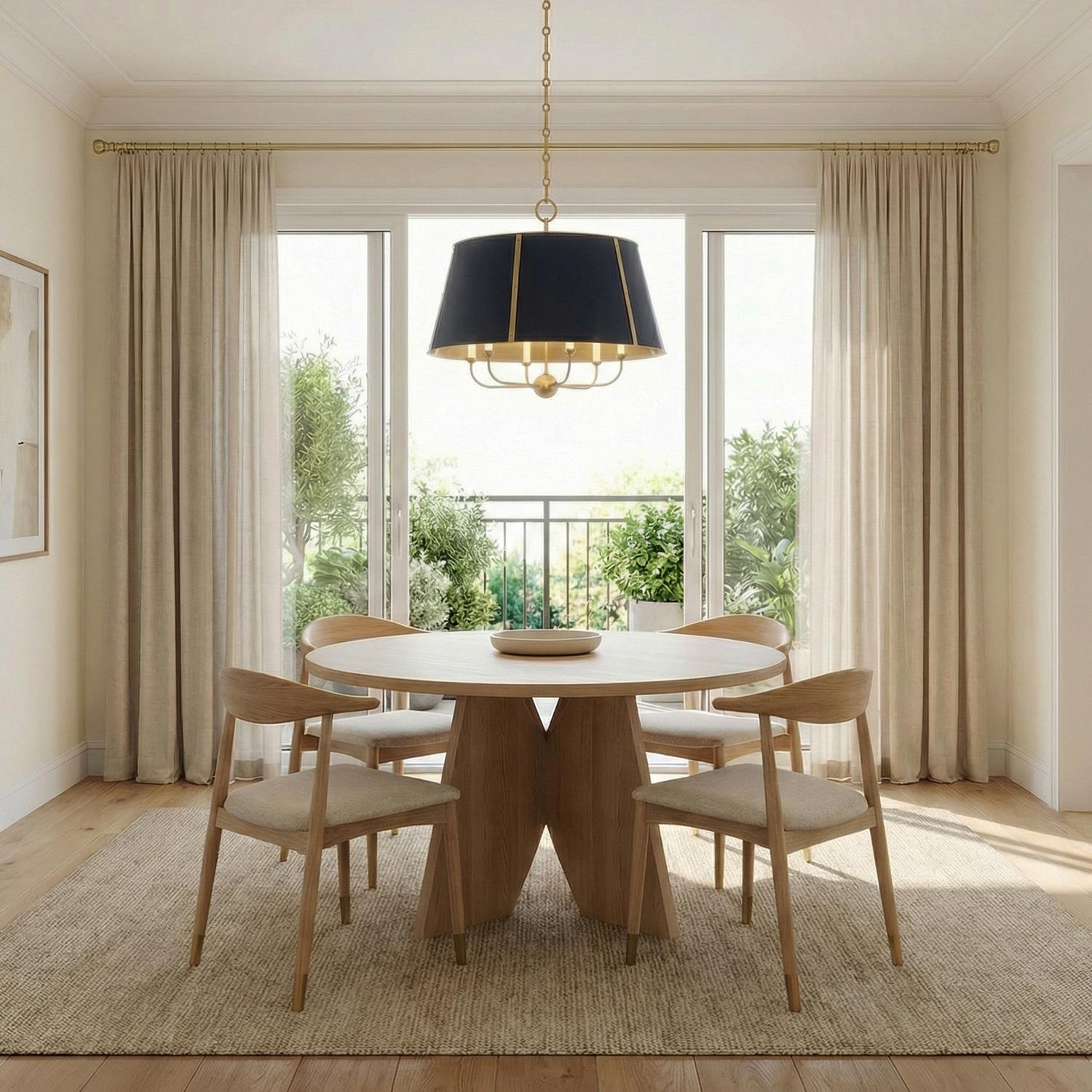 The Avery Pendant redefines traditional lighting with its luxurious balance of rich color and refined metalwork. This distinctive fixture showcases a sophisticated midnight blue shade elegantly framed by aged brass vertical supports that create architectural interest. The warm brass interior amplifies light when illuminated, creating a sumptuous atmospheric glow that transforms any space. Meticulous construction details, including visible brass hardware and clean linear elements, add a modern touch while maintaining timeless appeal. With its impressive 28.5" diameter and substantial presence, this generously scaled pendant produces rich, ambient illumination perfect for enhancing dining settings, kitchen islands, or entryway spaces. The Midnight Blue shade introduces a striking color statement that complements diverse interior aesthetics from classic to contemporary transitional.