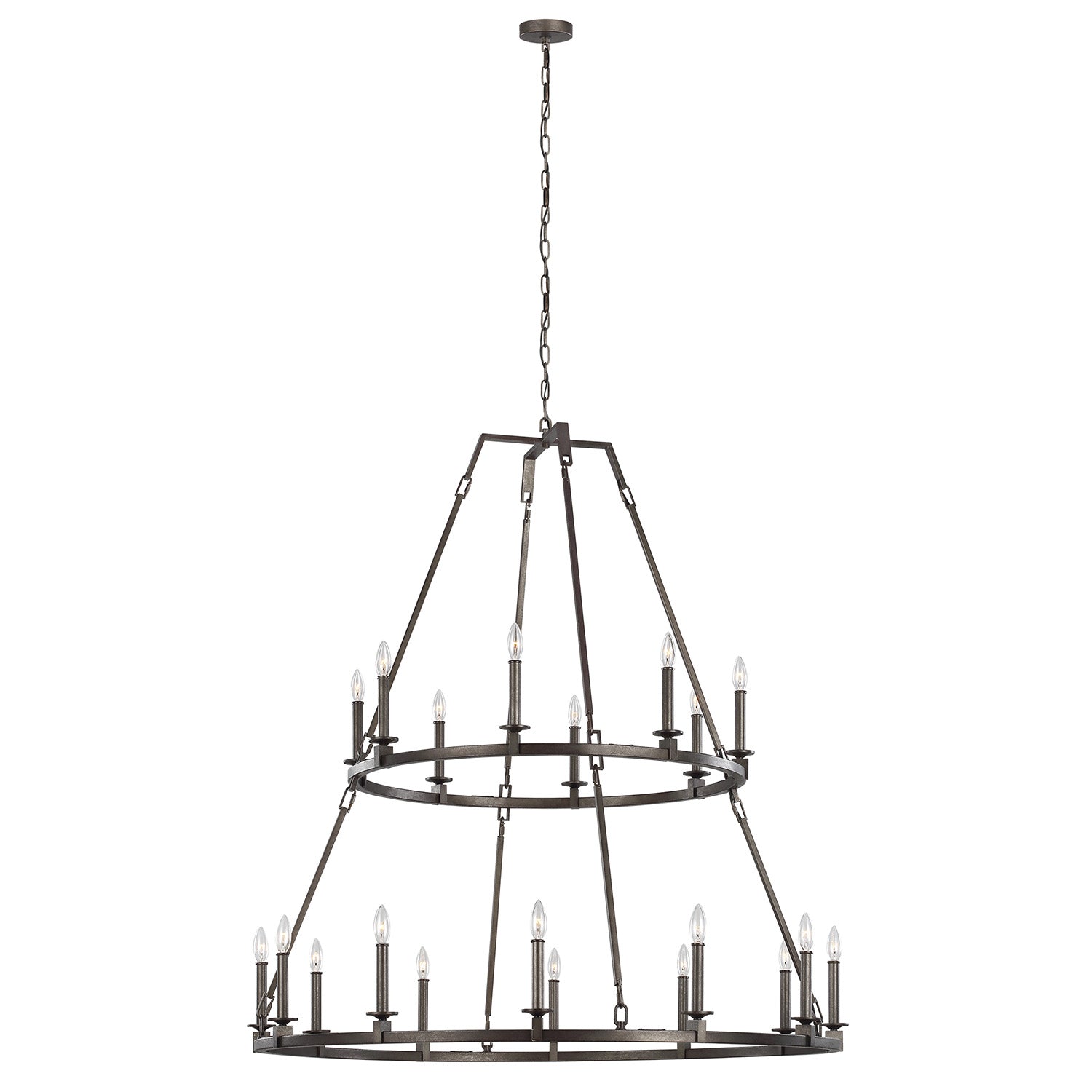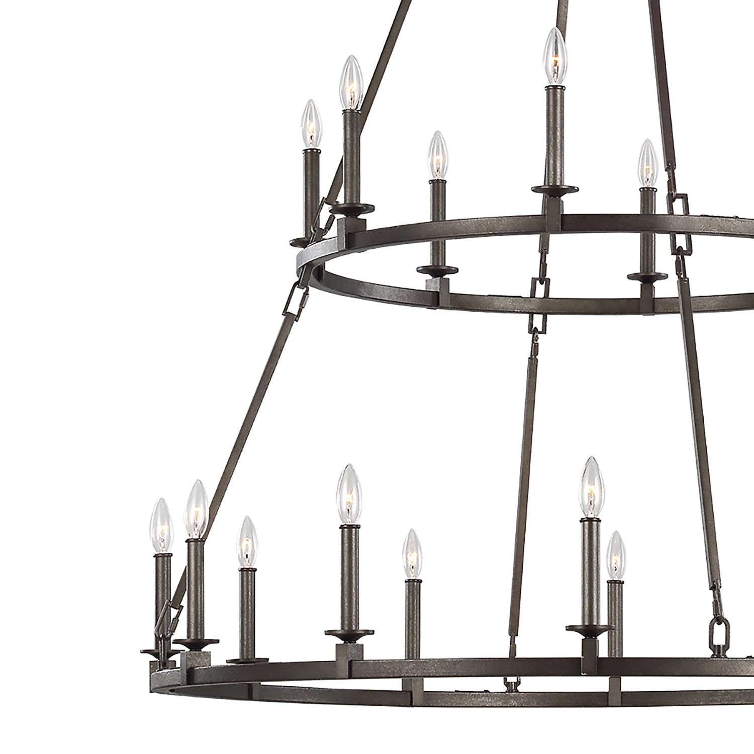 The Bernard Two-Tier Ring Chandelier makes a dramatic statement, blending a classic ring design with a transitional style that is versatile enough to fit within a wide range of decor, from farmhouse to urban loft. The two-tiered design, suspended by elegant arms, provides a sophisticated stage for twenty exposed candelabra bulbs, creating a grand and inviting glow. This fixture is thoughtfully designed to add a layer of timeless illumination to any space. With its ETL damp rating, it is a perfect centerpiece for a dining room, living space, or entryway where functional light and enduring style are needed. The rich Aged Steel finish offers a classic, industrial feel that complements the fixture's dramatic silhouette, adding both functional beauty and versatile appeal.