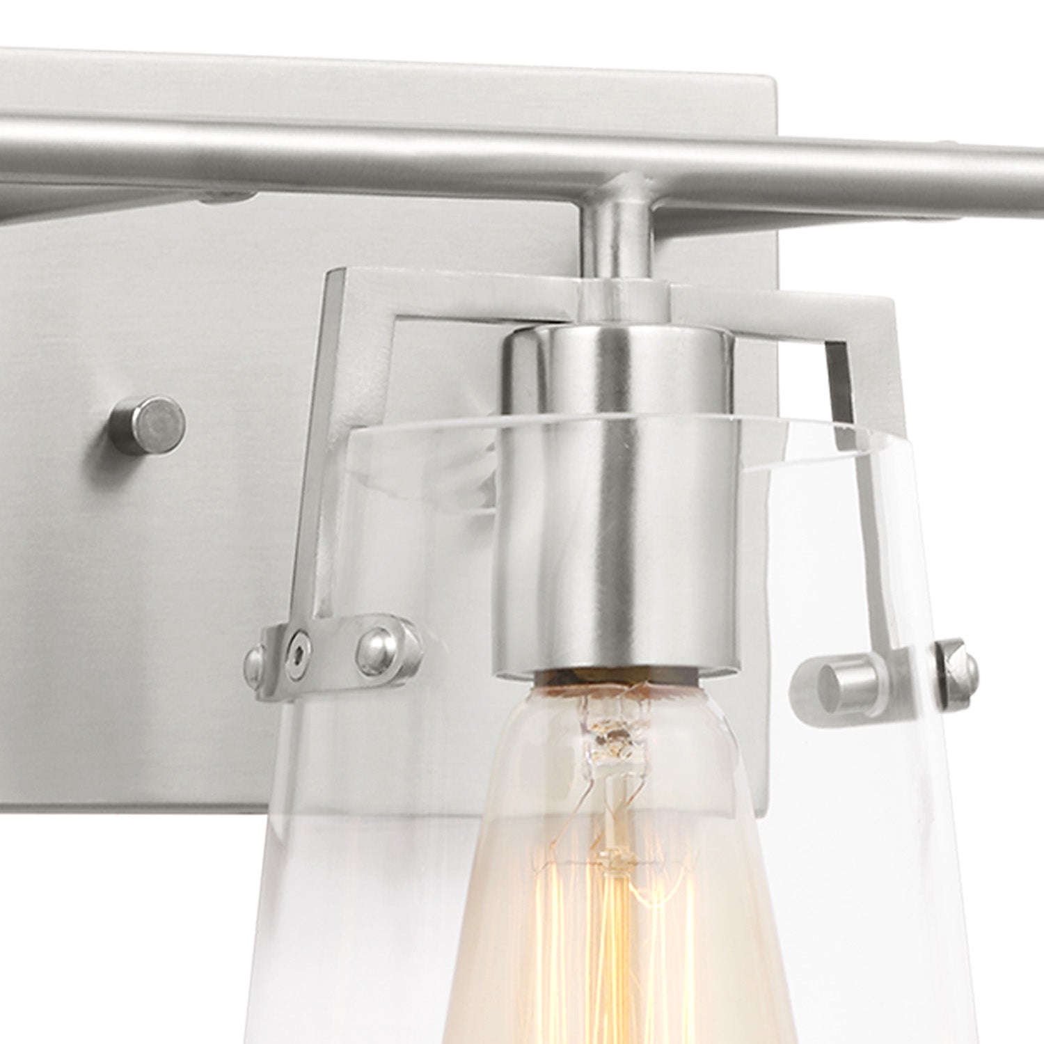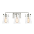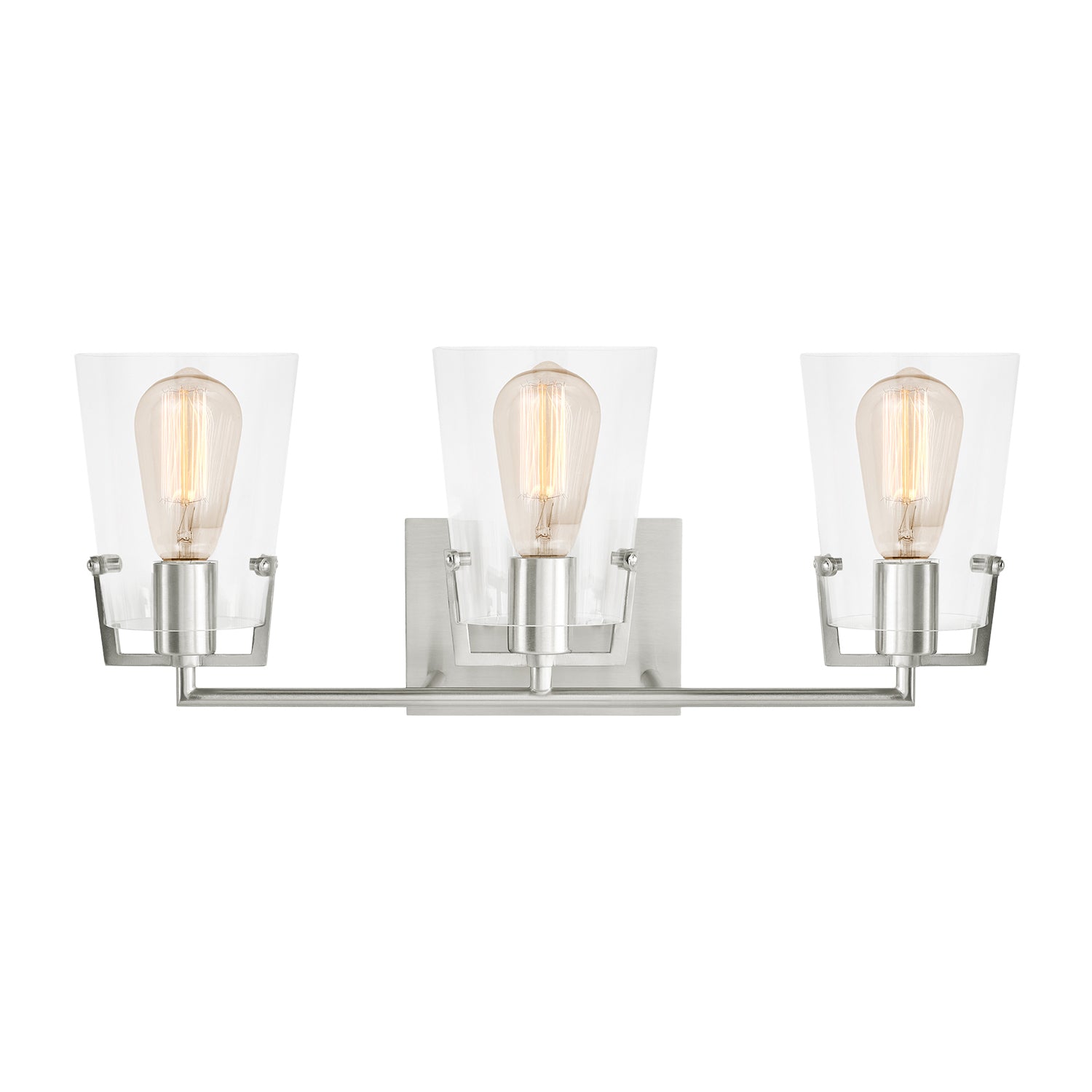 • Modern vanity light with a clean-lined silhouette and three clear glass shades