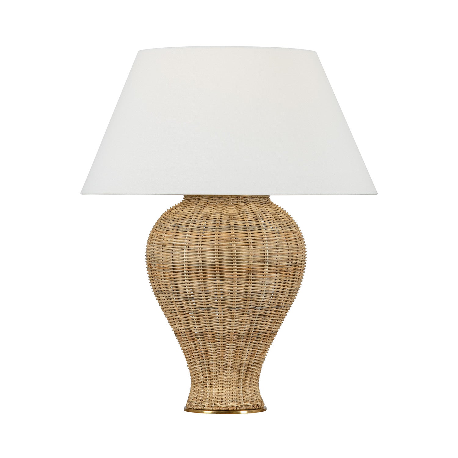 The Josephine Table Lamp is a modern coastal accent light that makes a captivating statement with its organic, sculptural base and contrasting classic shade. The fixture features a beautifully curved base crafted from natural woven wicker, creating a warm, textural element that is anchored by subtle Aged Brass accents. The lamp is topped with a crisp off-white linen shade, providing soft, diffused, ambient light. This statement table lamp is thoughtfully sized to add a layer of inviting light and natural texture to a bedside table, living room console, or entryway. With its UL dry rating, it offers both functional beauty and versatile appeal. The combination of natural wicker and Aged Brass delivers enduring style and a perfect blend of modern elegance and relaxed charm.