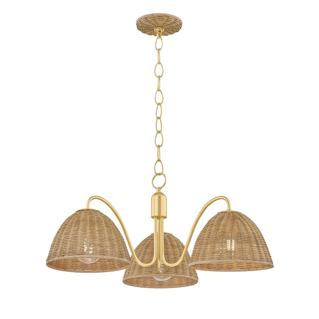 Karina 3 Light Chandelier 28", Woven Wicker and Aged Brass