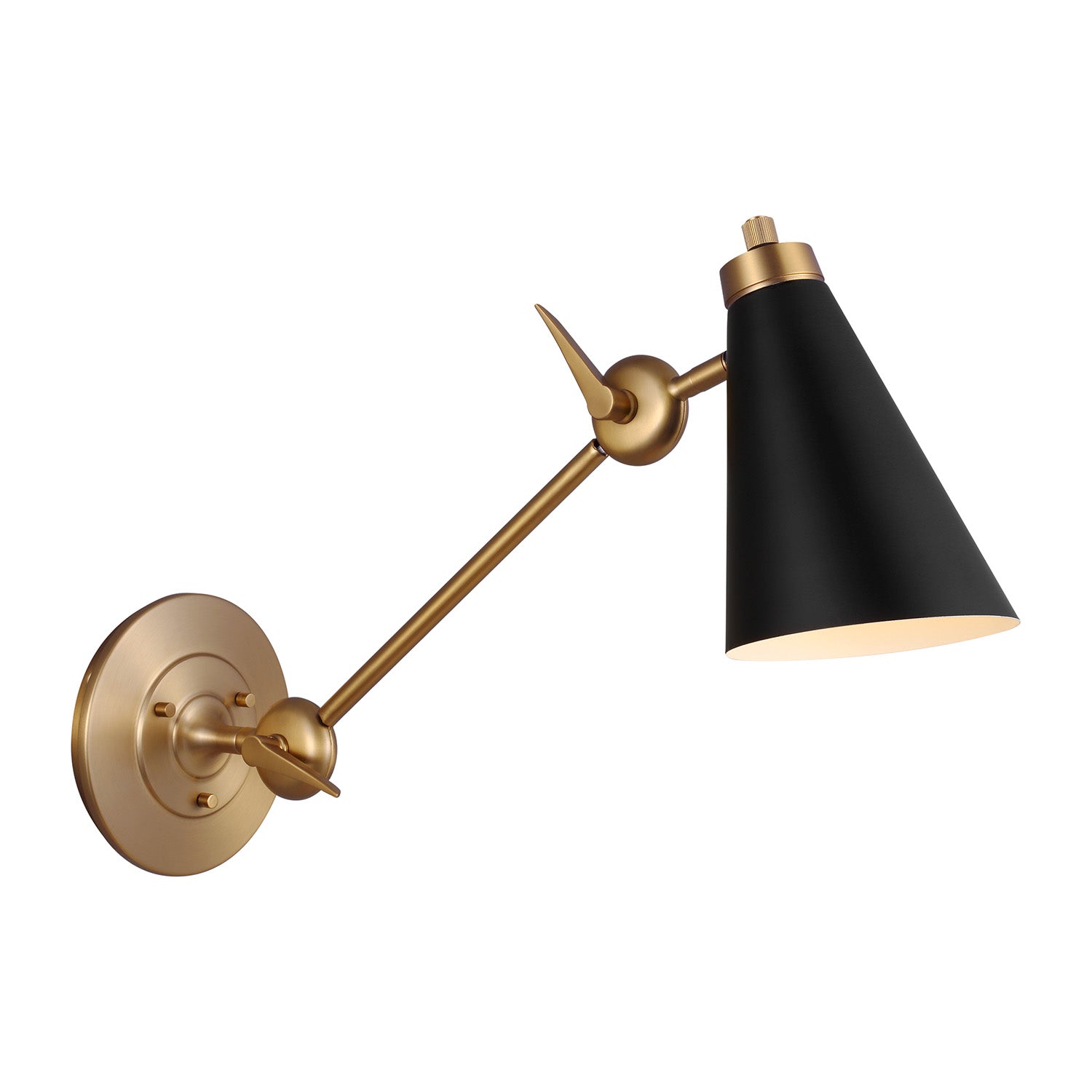 The Langdon Adjustable Two Arm Wall Sconce makes a sophisticated statement with its minimalist design and clean, functional form. This fixture features a wide, adjustable dual arm with a single conical shade. Its versatile design allows the shade to be rotated to cast light in the direction that best suits your room, making it an ideal choice for a reading nook, a hallway, or as a modern accent on a wall. The sophisticated two-tone finish of matte black and modern brass combines to create a chic look that is a perfect complement to modern and contemporary decor. This striking sconce is a perfect blend of style and functionality, adding a touch of refined elegance to your interior.