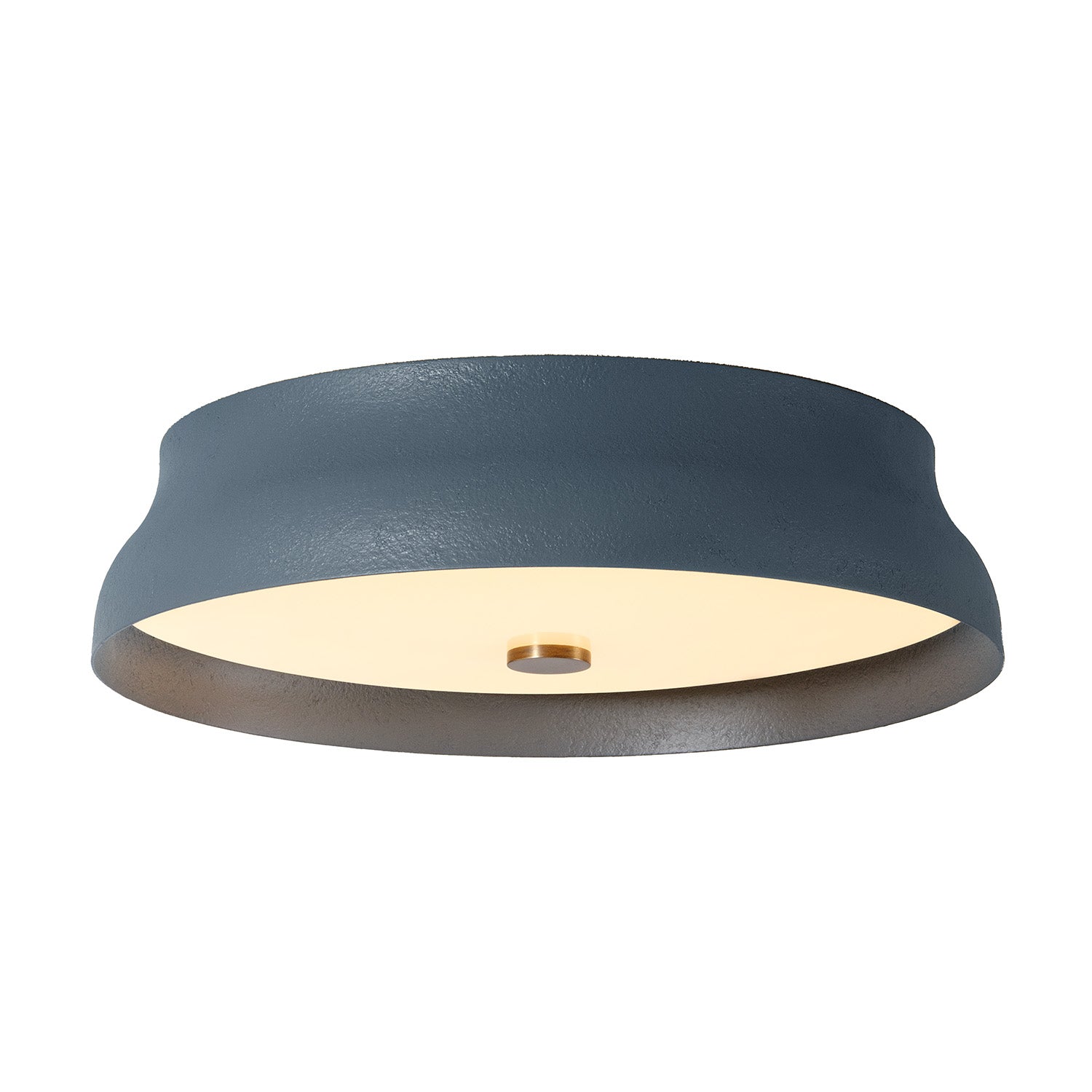 The Lark LED Flush Mount 16" takes the traditional flush mount silhouette in a new direction, merging a minimalist profile with a high-performance integrated light source. The iron frame flares subtly around an opal glass diffuser, creating a soft, ambient glow that eliminates harsh shadows while maintaining a clean, architectural look. Finished in a deep Slate with blue undertones and Patina Brass accents, this fixture brings a contemporary piece to entryways, living rooms, and hallways, serving as a versatile solution for modern interiors. Its expansive 16" diameter and low-profile height make it an ideal choice for larger spaces with standard ceiling heights where a sophisticated, understated aesthetic is desired.