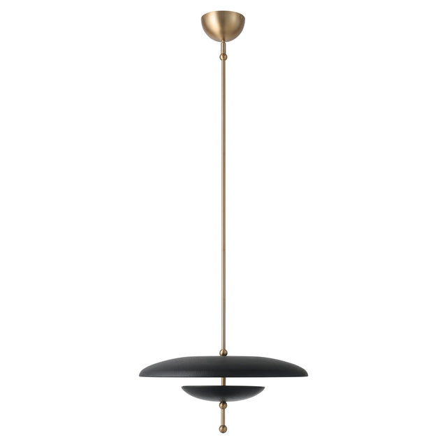 The Lloyd Large LED Pendant 20" offers a sophisticated pairing of black faux leather and a warm satin brass finish, delivering a refined aesthetic to modern interiors. Its mid-century–inspired silhouette features a softly domed shade with an integrated LED that reflects light upward to create a gentle, ambient glow. This versatile fixture is designed for adaptability, converting easily for use as either a pendant or a semi-flush mount to suit varying ceiling heights. The canopy is equipped with a swivel joint, ensuring the piece is fully compatible with sloped ceiling installations. This striking fixture is an ideal choice for adding a refined architectural touch to modern dining rooms, grand entryways, or sophisticated home offices.