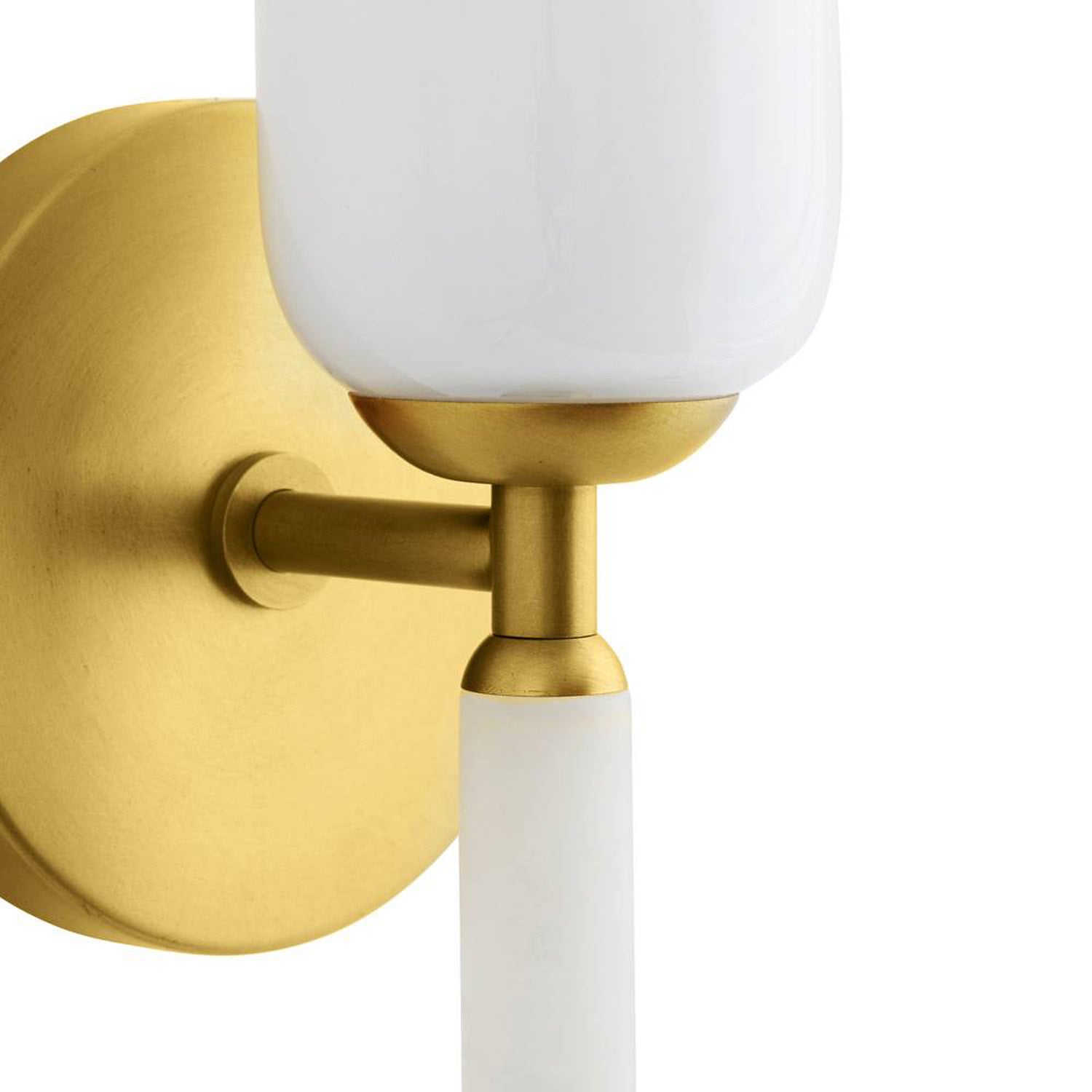 • Riona features a modern wall sconce silhouette defined by an opal glass shade, an antique brass iron frame, and a decorative real Alabaster post