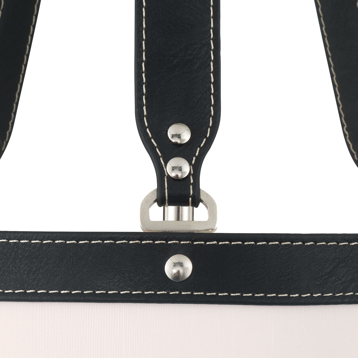 • The polished nickel finish paired with black vegan leather adds a touch of tailored sophistication to the modern form