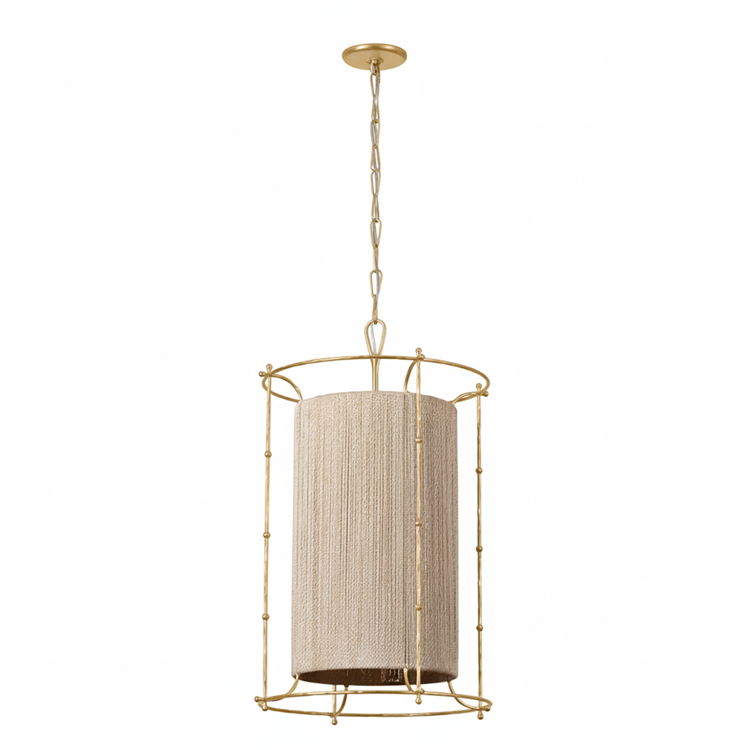 • Statement pendant with a large, natural rope cylindrical drum shade and gold leaf frame