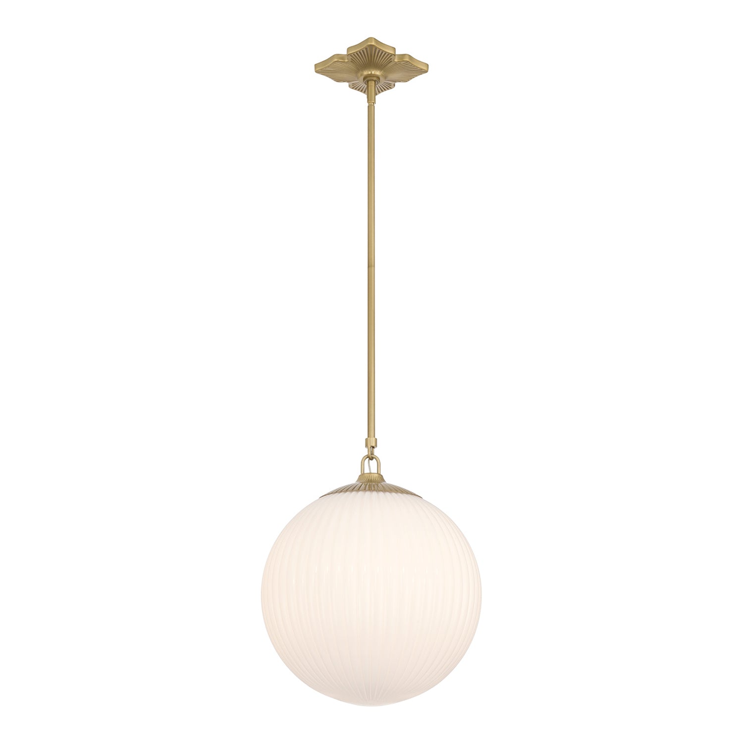 • Features an opal ribbed glass globe paired with a detailed, deco-inspired quatrefoil canopy