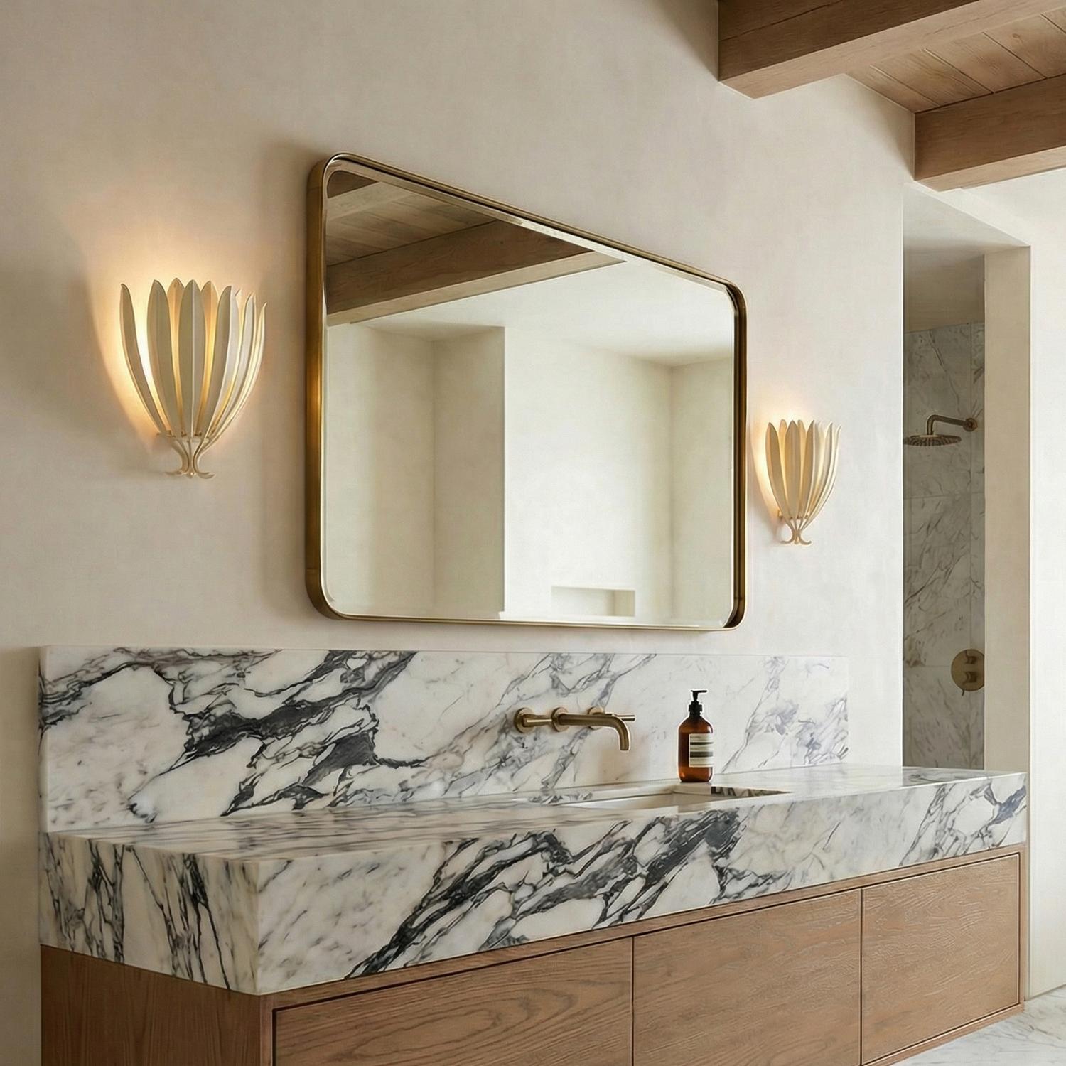 Leaning into a botanical motif, the Yasmin Wall Sconce is defined by elongated leaf-like metal pieces that form a glowing shade around the light source. As light emanates outwards, it filters through the layered foliage, creating a rhythmic and nature-inspired atmosphere that brings a sense of the outdoors into contemporary interior spaces. This iron fixture balances a sense of organic movement with a clean, structured finish, making it a sophisticated addition to hallways, bedrooms, or living areas.