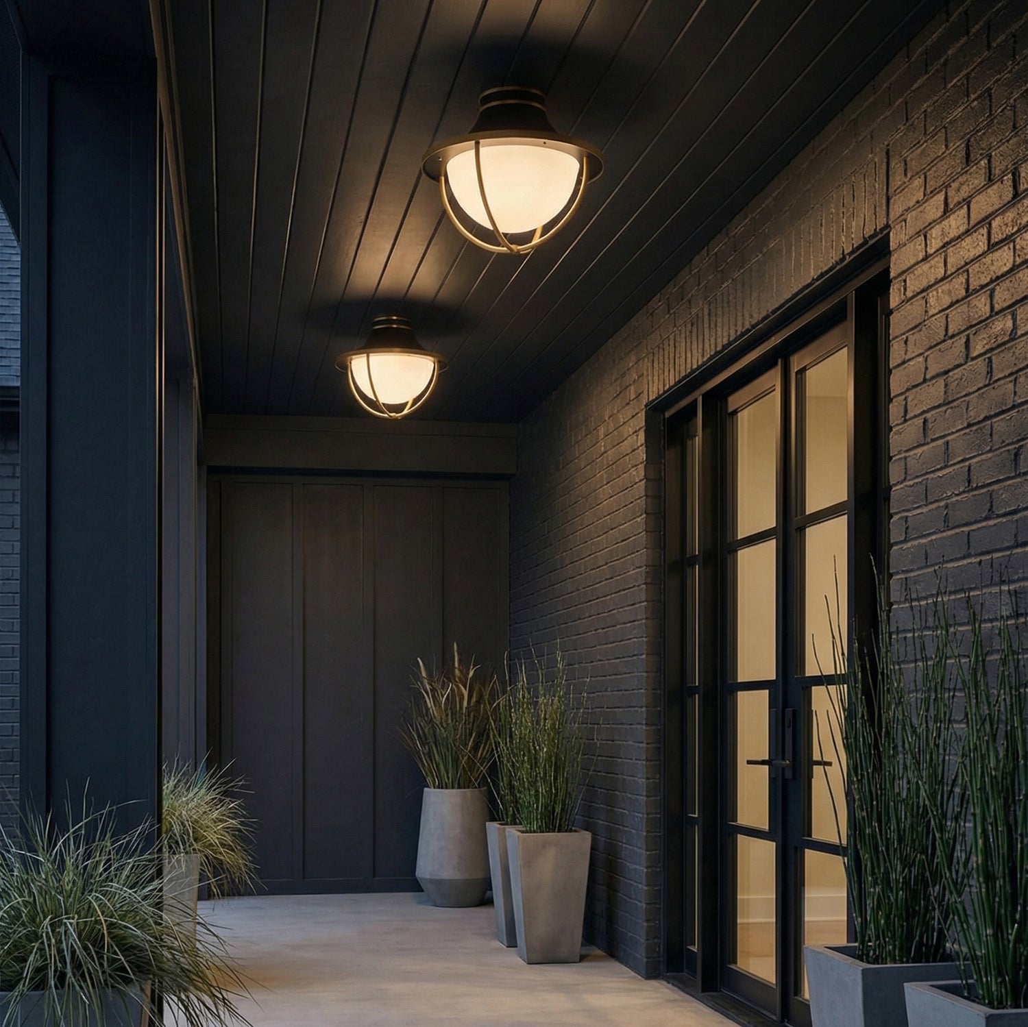 The Tobin Outdoor Flush Mount features a modern design with a two-tone finish of Matte Black and Textured Gold. The distinctive silhouette showcases elegant gold arcs that gracefully frame an opal glass bowl, creating a sophisticated lighting element for your home's exterior. This ceiling fixture measures 12" tall and 13.5" in diameter, making it perfect for covered porches, entryways, or outdoor living spaces with lower ceilings. The combination of sleek metal and smooth glass creates a contemporary aesthetic that complements various architectural styles. Weather-resistant and wet-rated for outdoor use, the Tobin provides both functional illumination and decorative appeal.